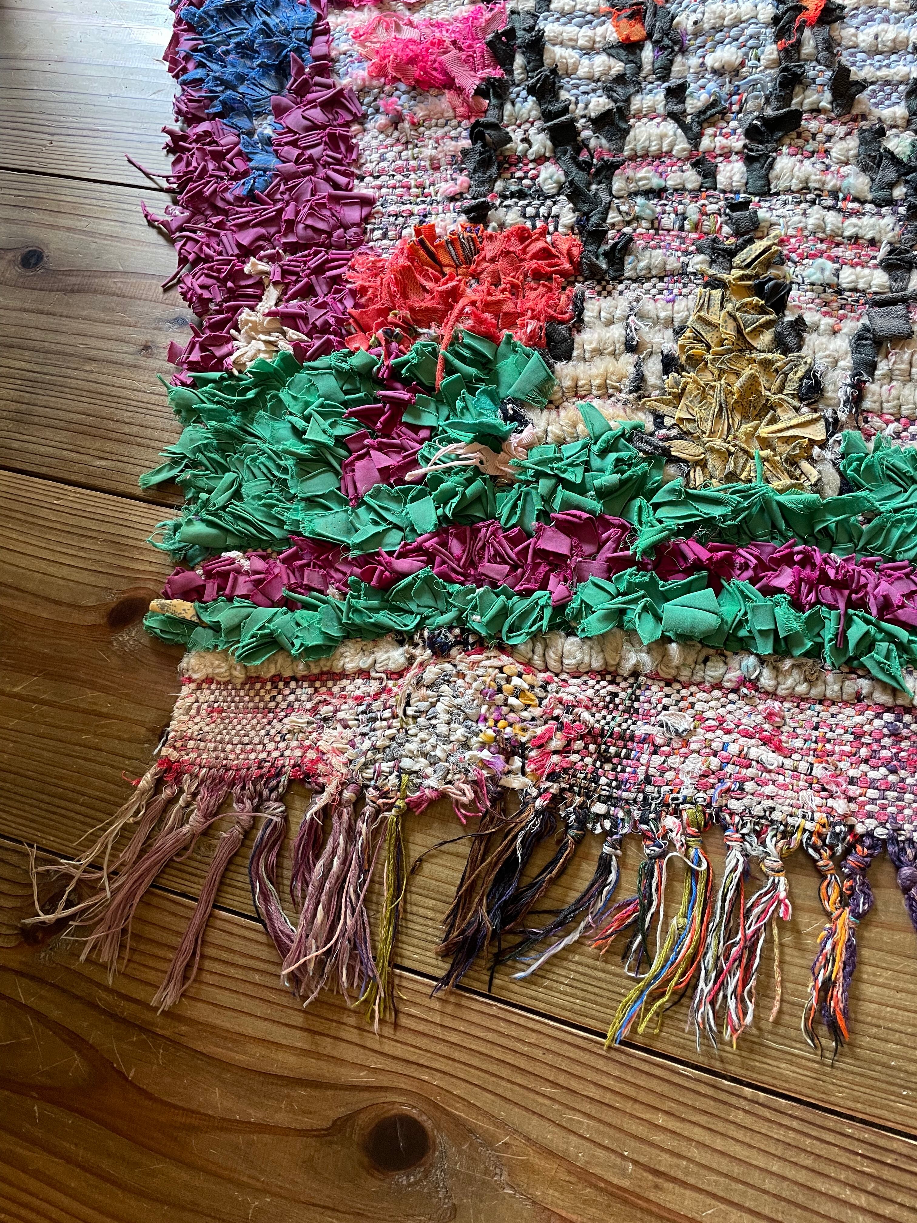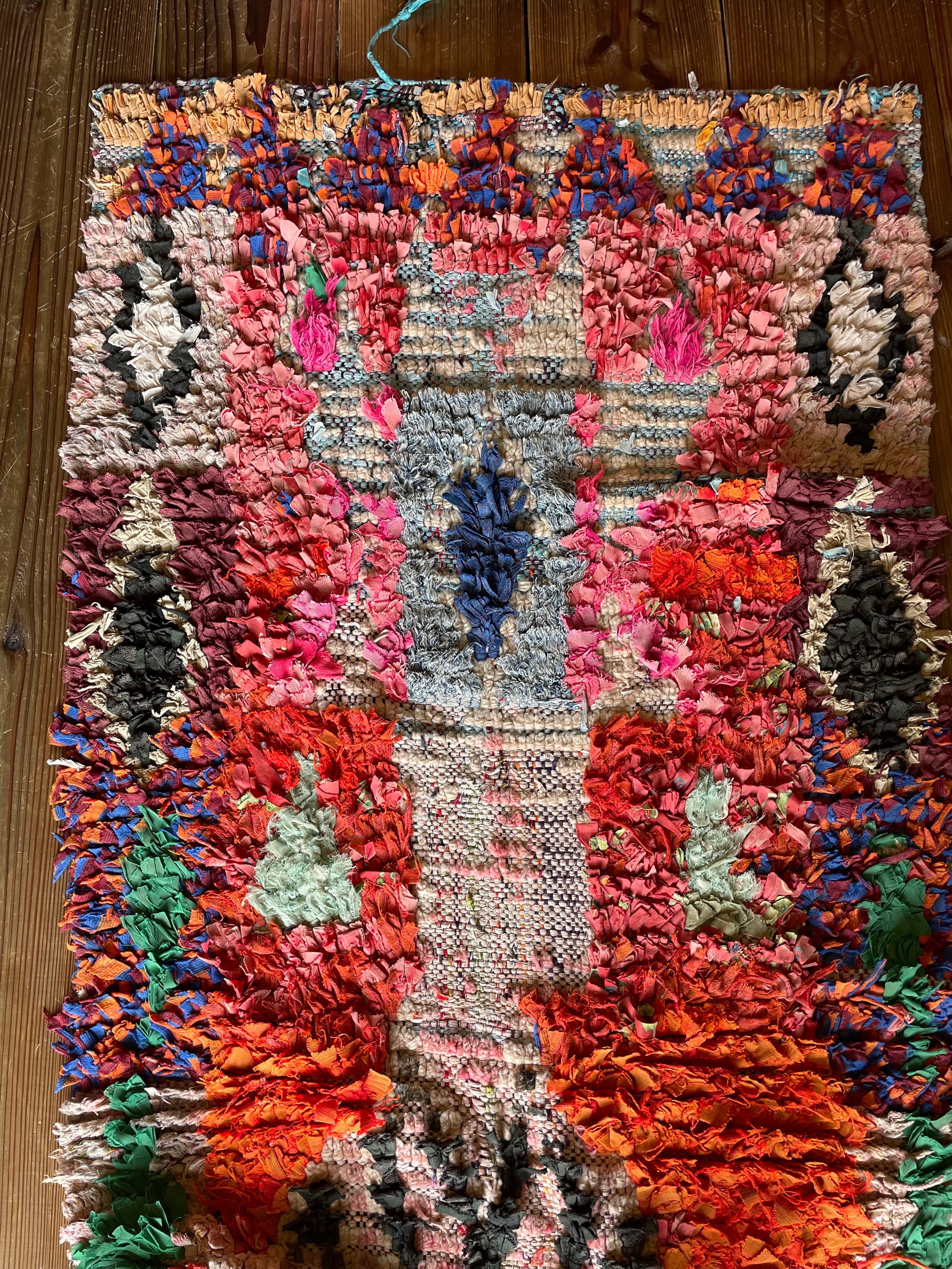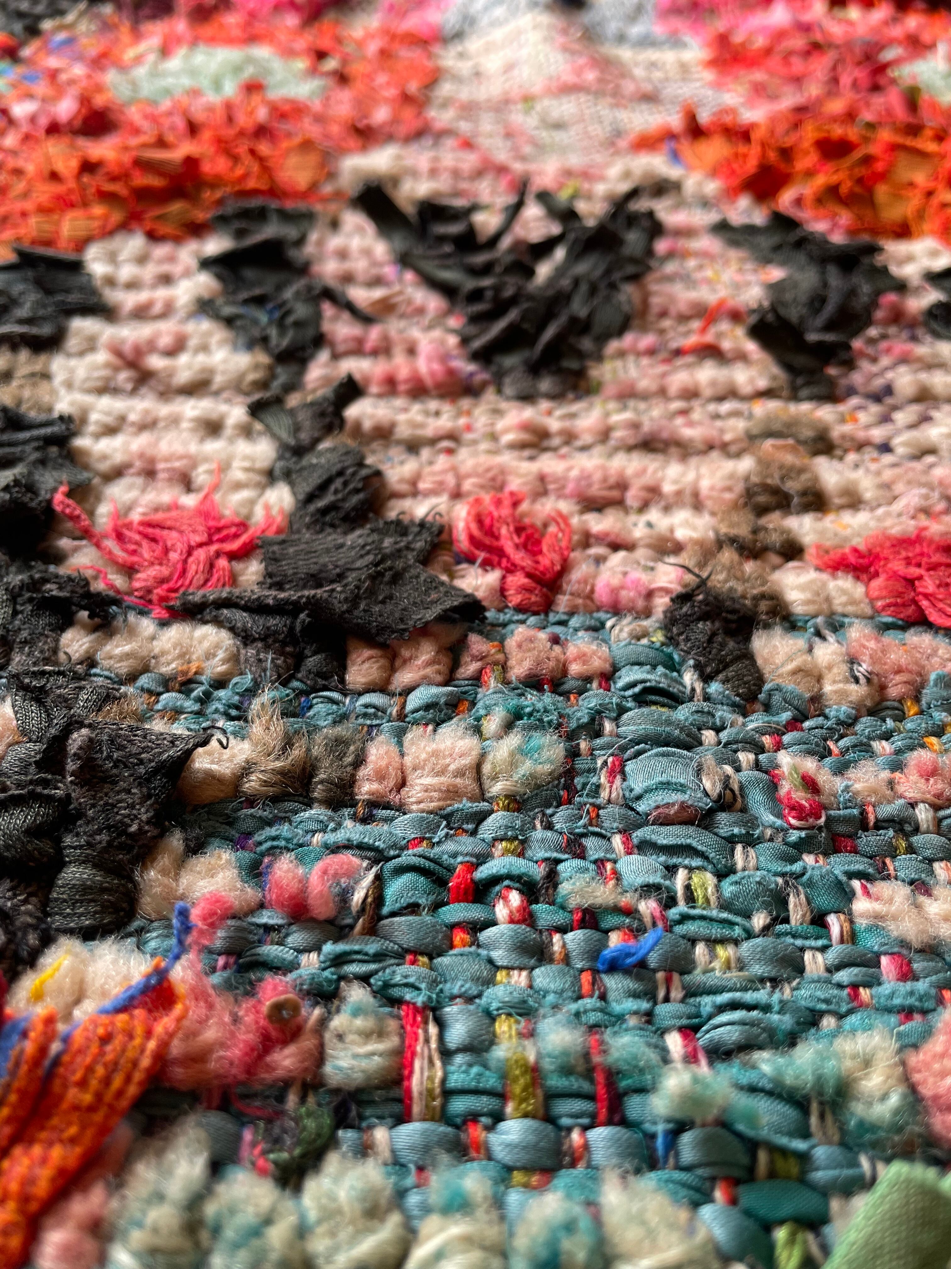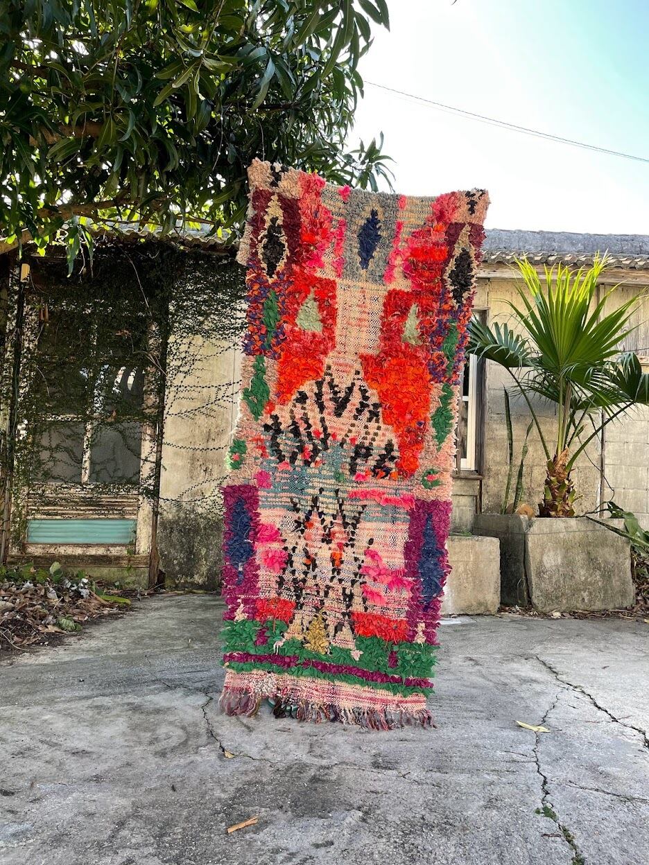 不思議な柄が織子さんの住んでいる土地や気持ちを表したと思われる個性あるデザイン。オレンジ・ピンク・緑色がレトロな1990年代生まれのベルベルアートです。