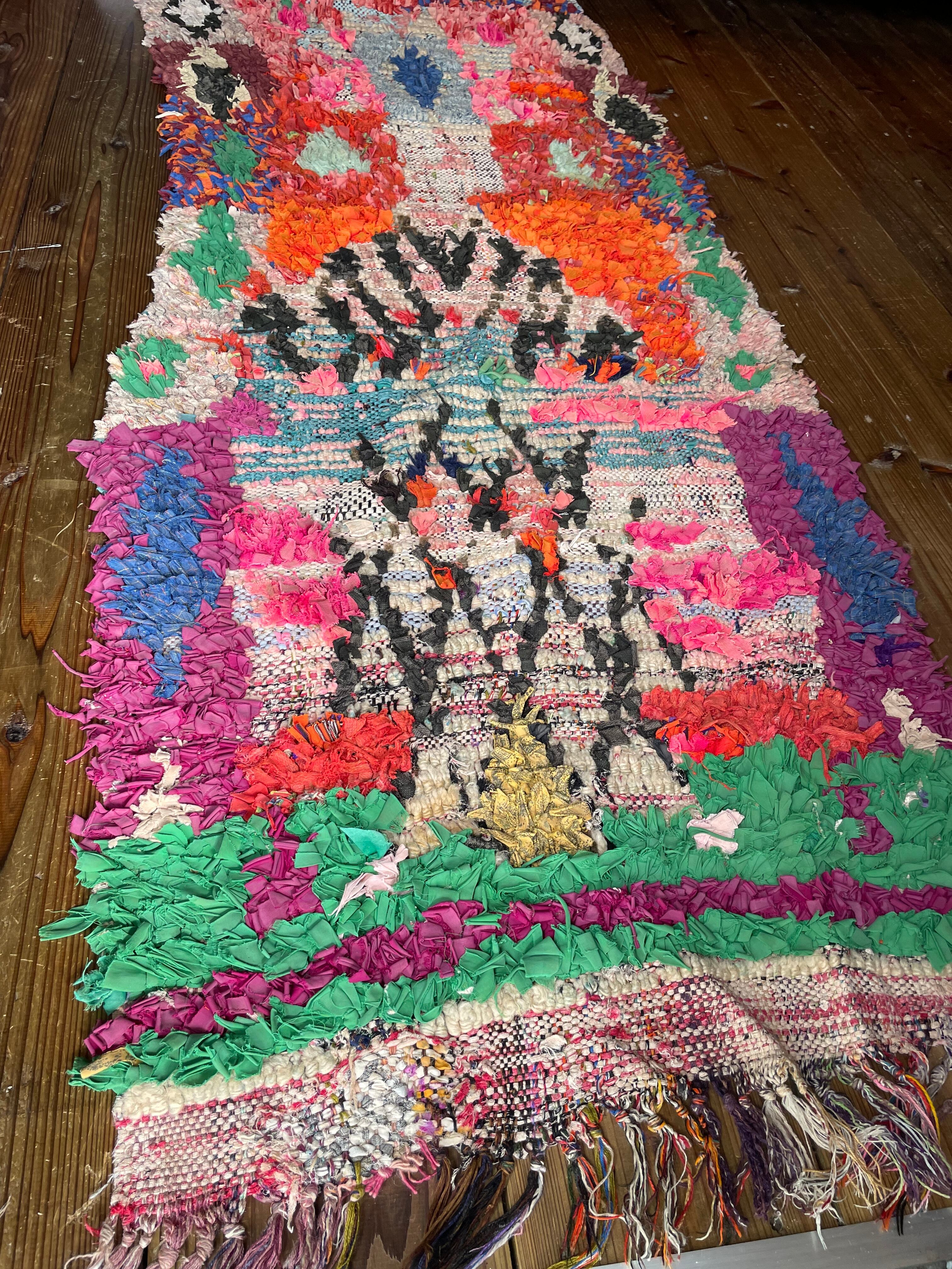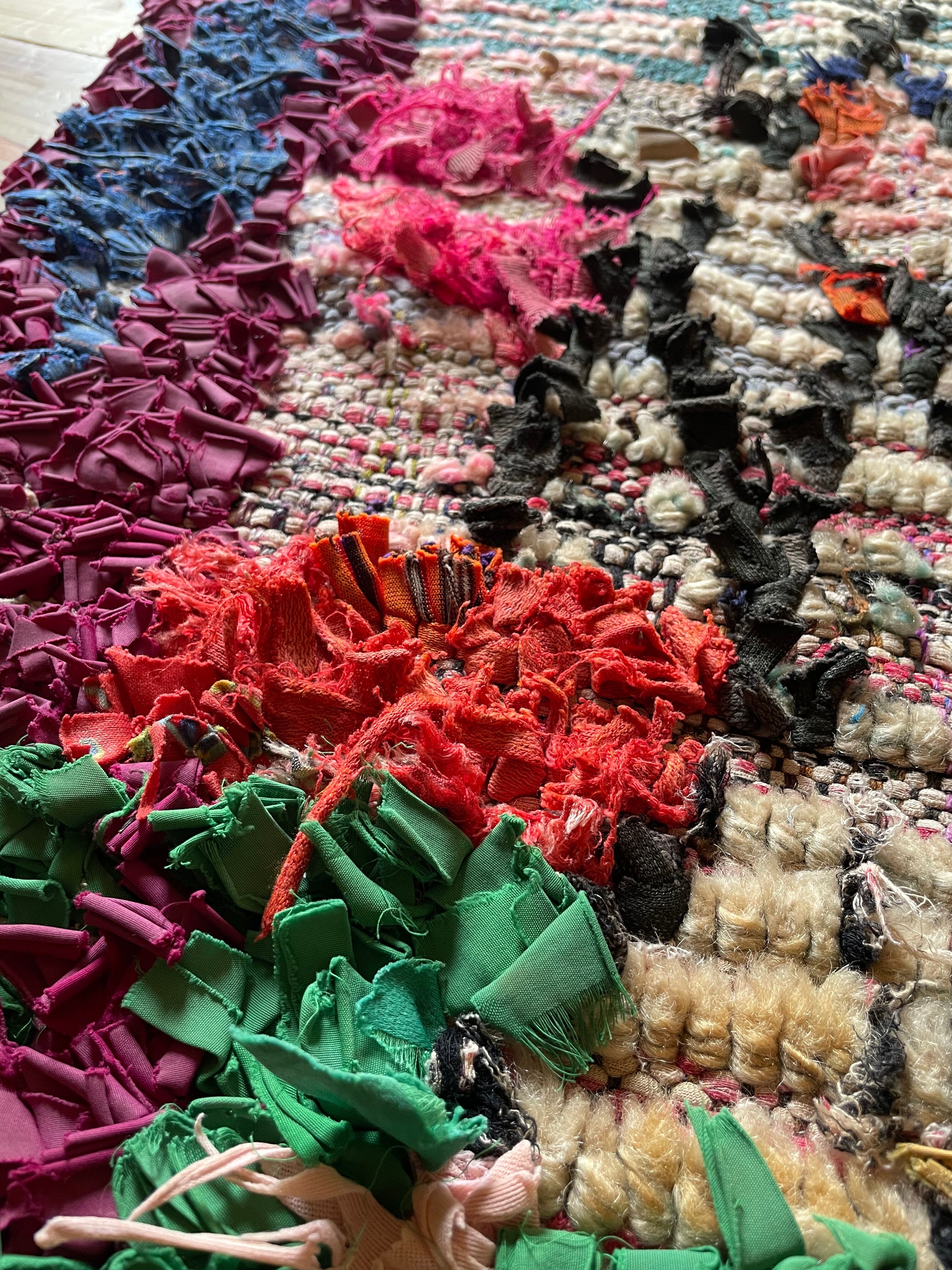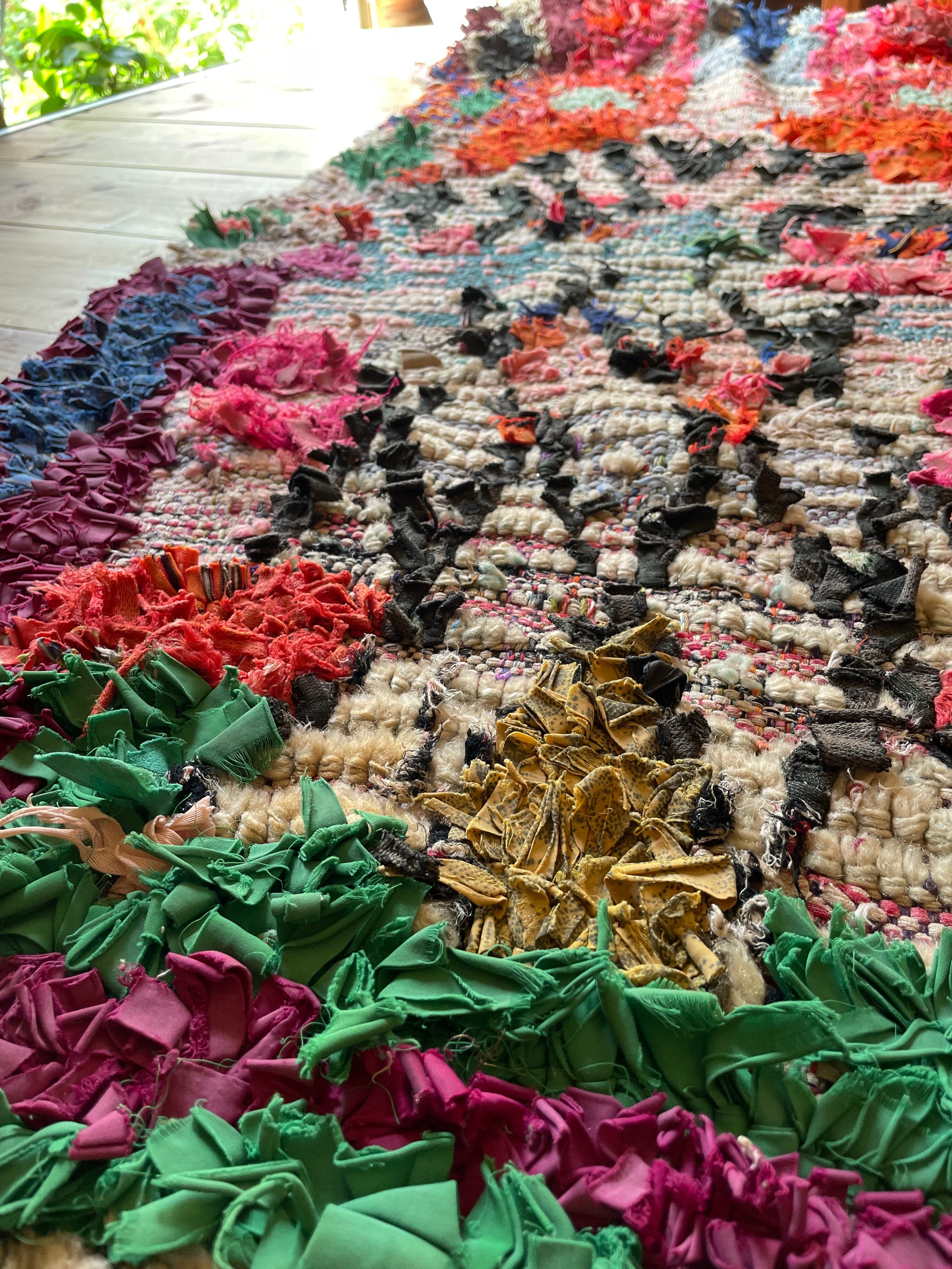 不思議な柄が織子さんの住んでいる土地や気持ちを表したと思われる個性あるデザイン。オレンジ・ピンク・緑色がレトロな1990年代生まれのベルベルアートです。
