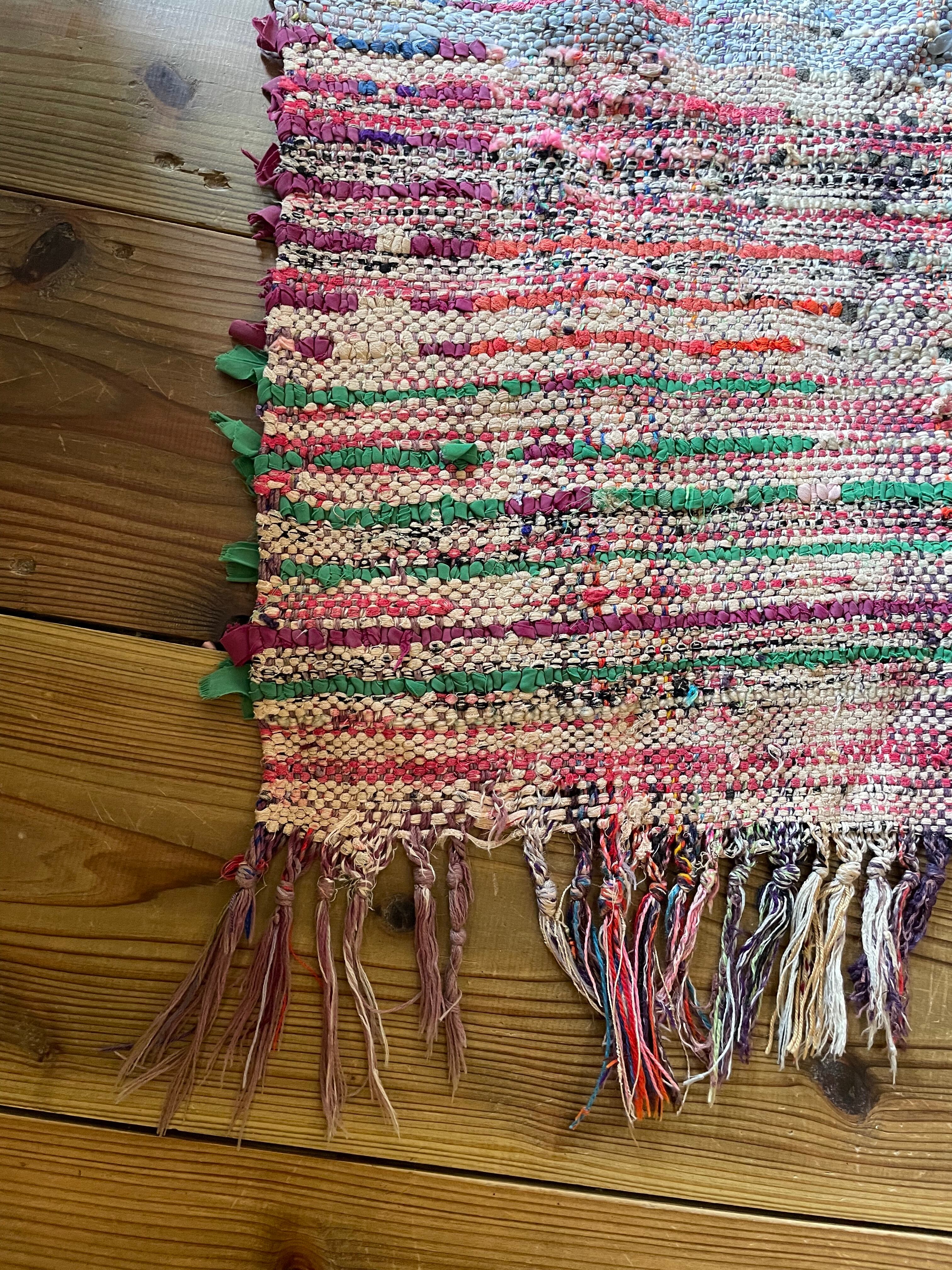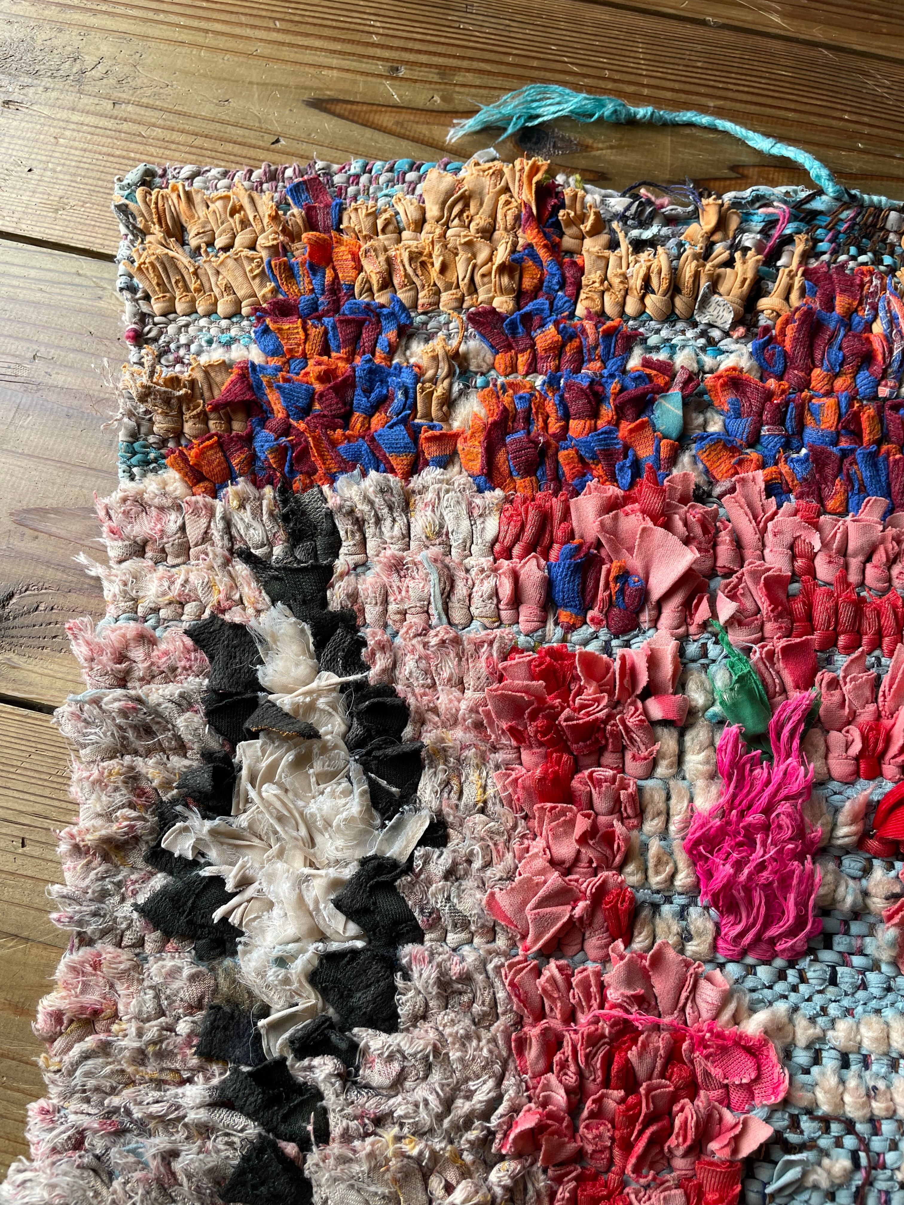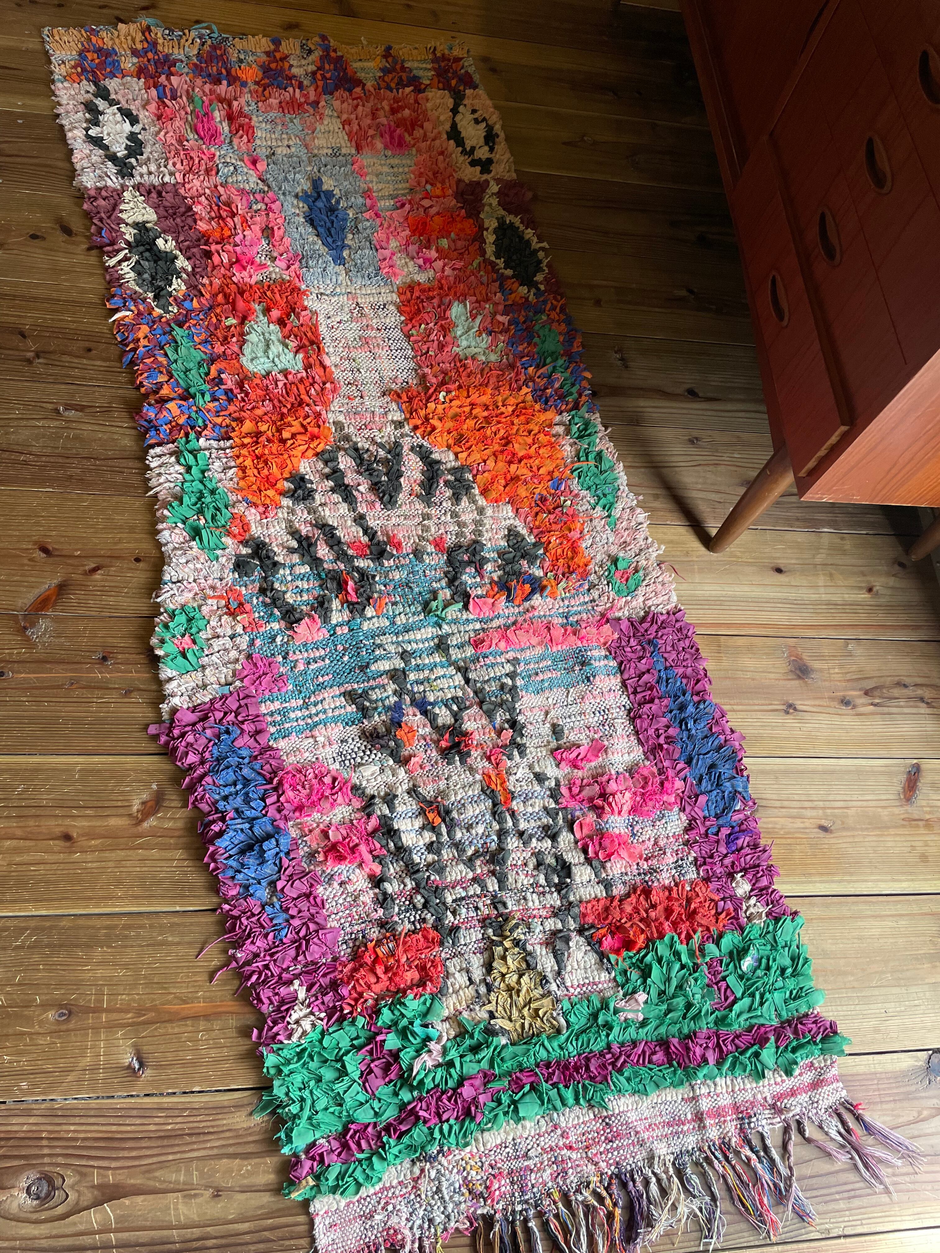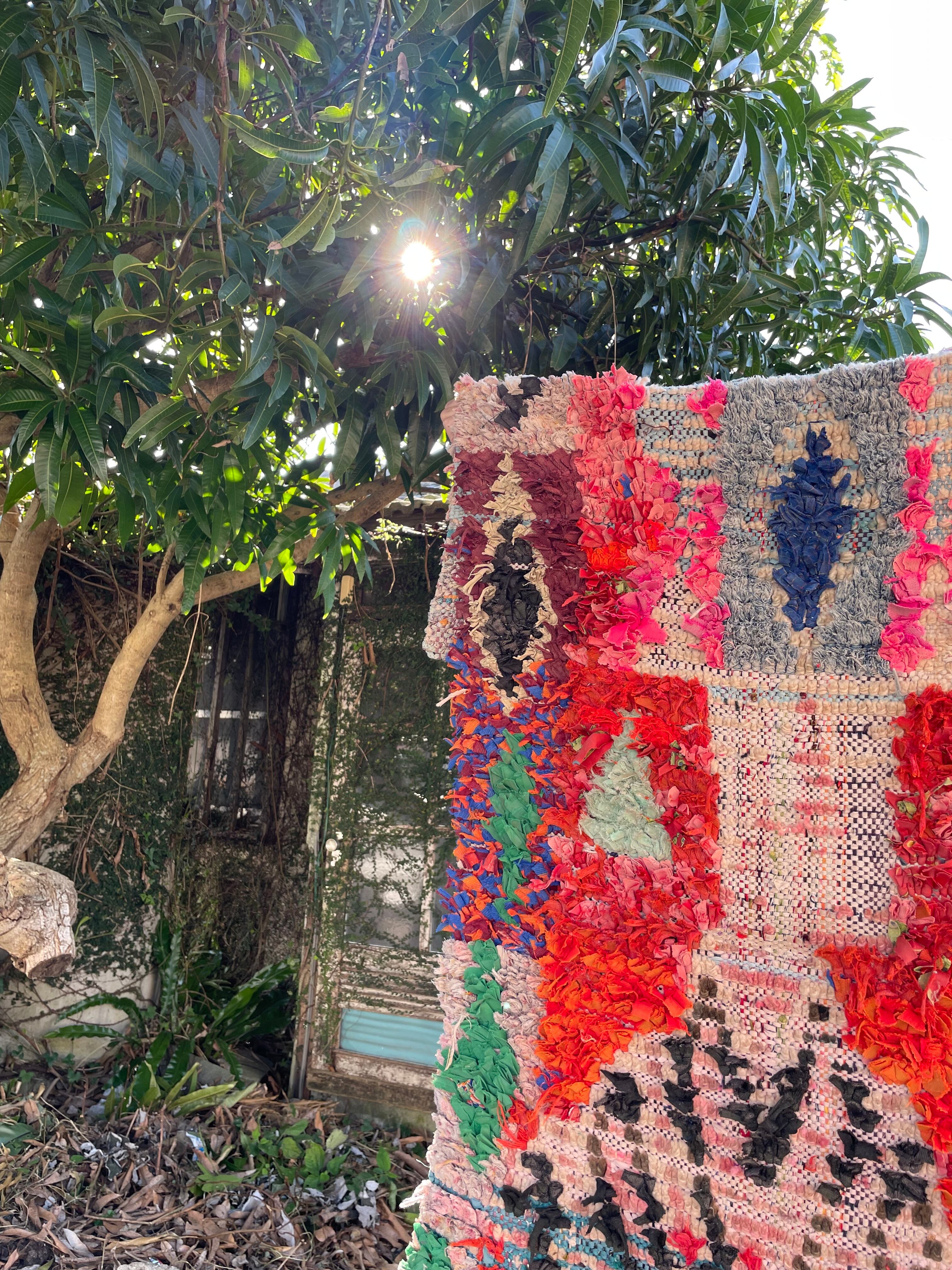 不思議な柄が織子さんの住んでいる土地や気持ちを表したと思われる個性あるデザイン。オレンジ・ピンク・緑色がレトロな1990年代生まれのベルベルアートです。
