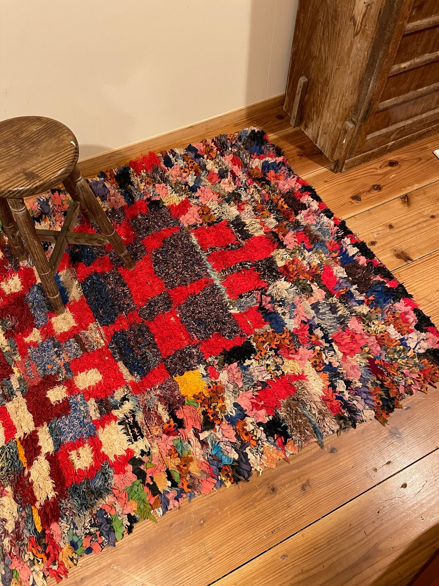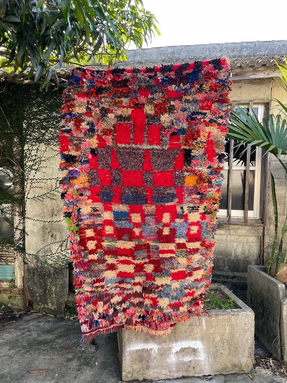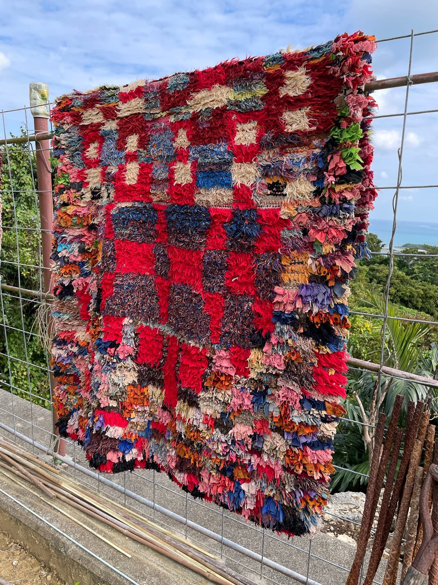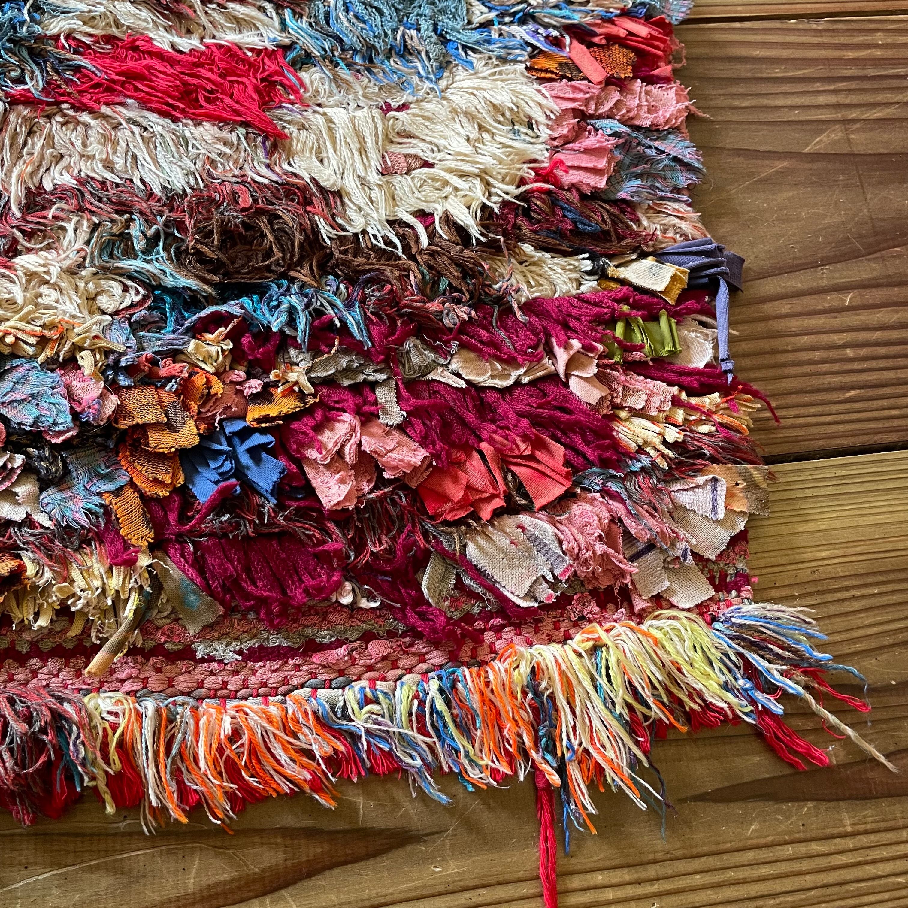 沢山の種類の古着と糸が使われていて、織子さんの思い出と温かさがたっぷり詰まった愛を感じる一枚です。鮮やかな色味ですが敷いてみるとなんだかとても落ち着くのは、フワフワ感が残っていて肌触りも気持ち良いからでしょう。1990年代生まれのベルベルアートです。