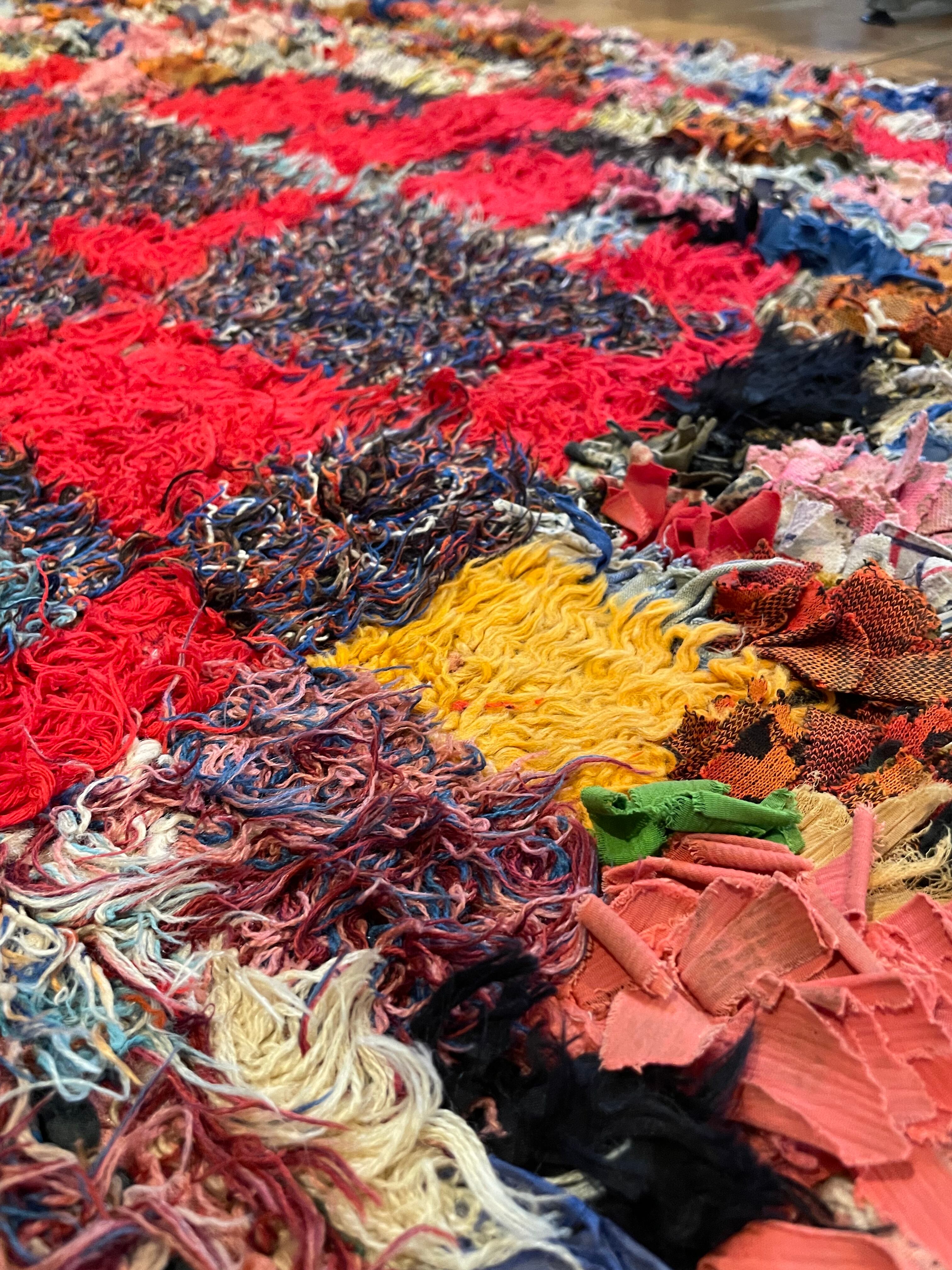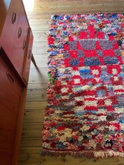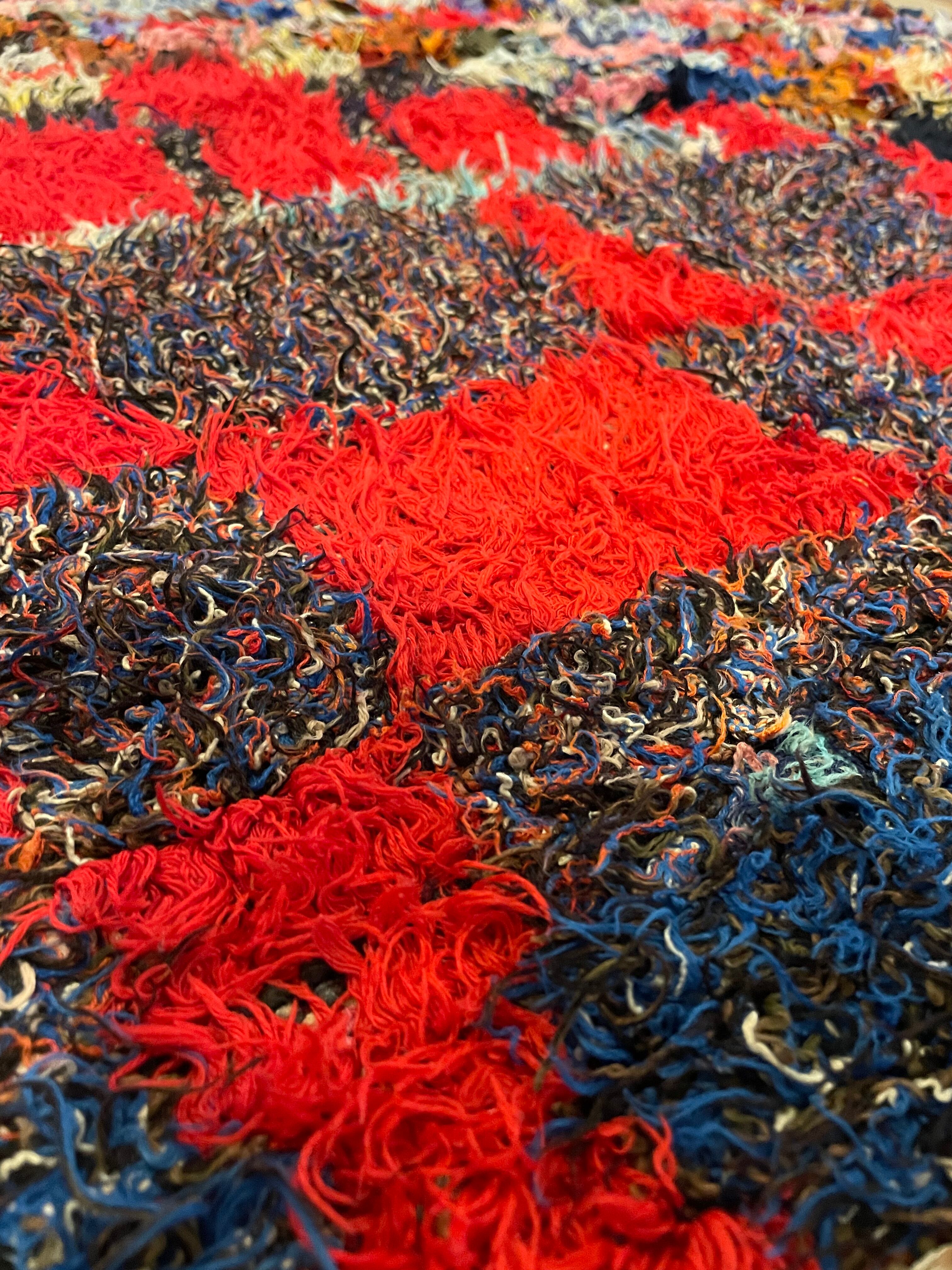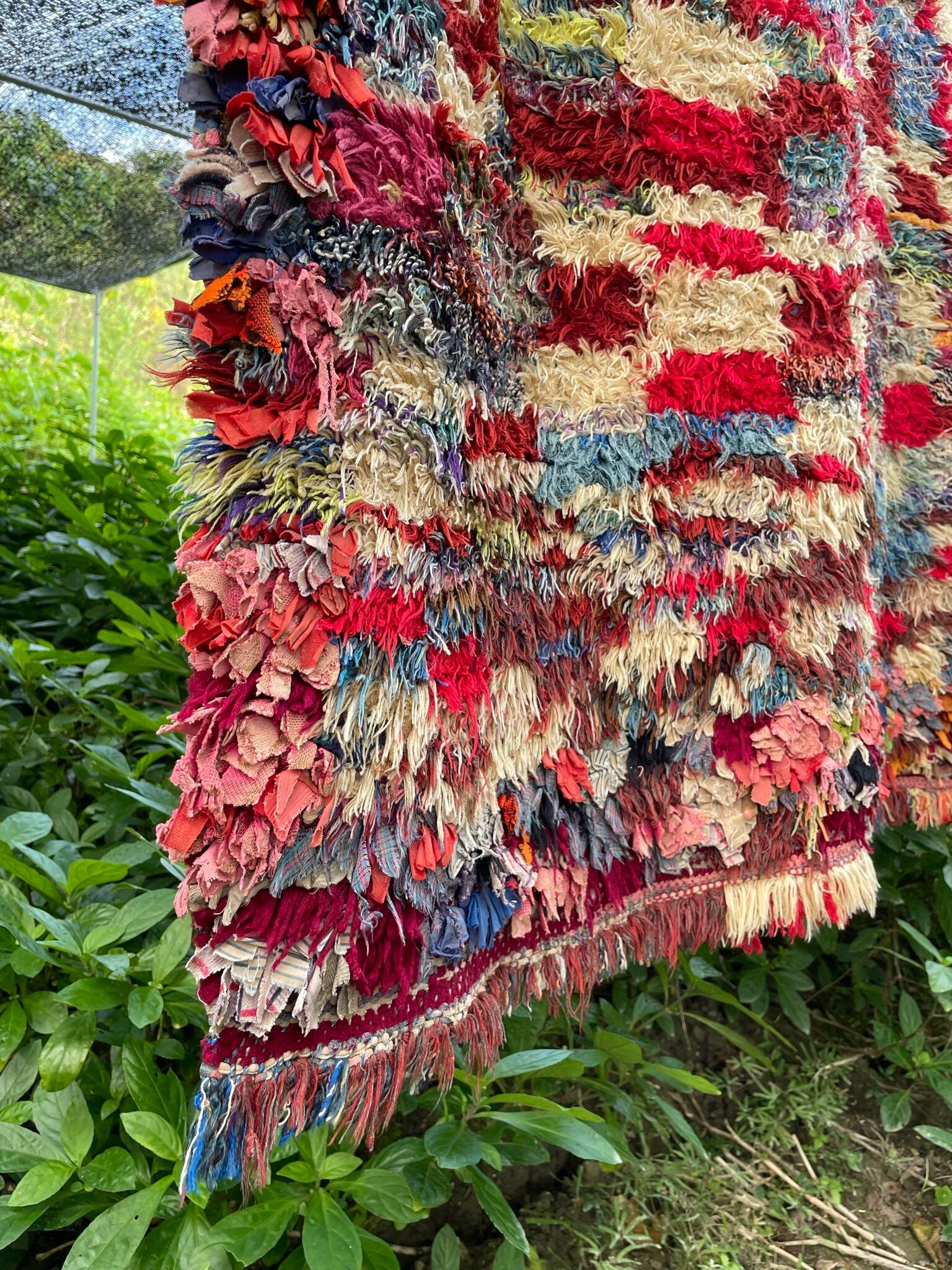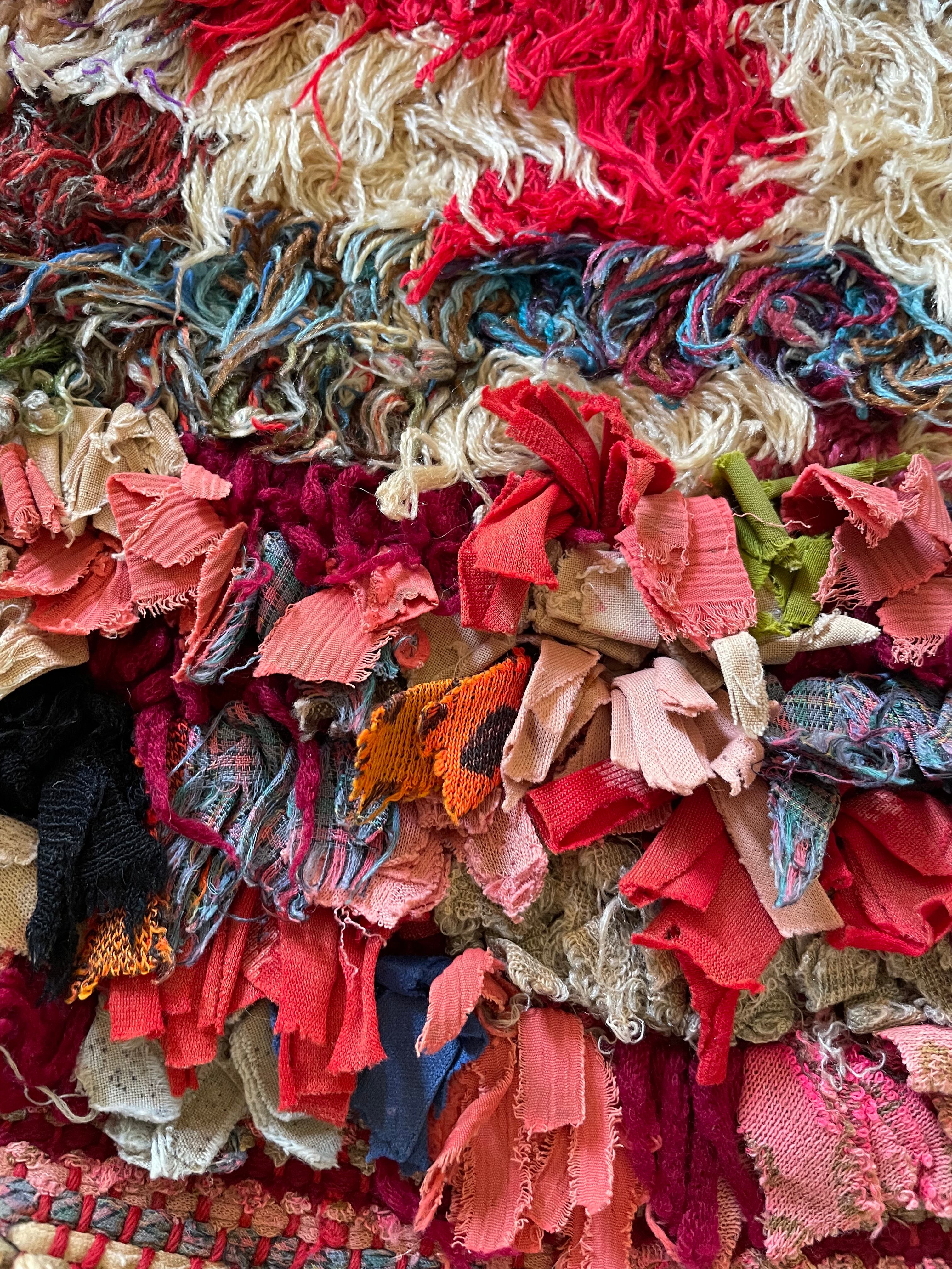 沢山の種類の古着と糸が使われていて、織子さんの思い出と温かさがたっぷり詰まった愛を感じる一枚です。鮮やかな色味ですが敷いてみるとなんだかとても落ち着くのは、フワフワ感が残っていて肌触りも気持ち良いからでしょう。1990年代生まれのベルベルアートです。