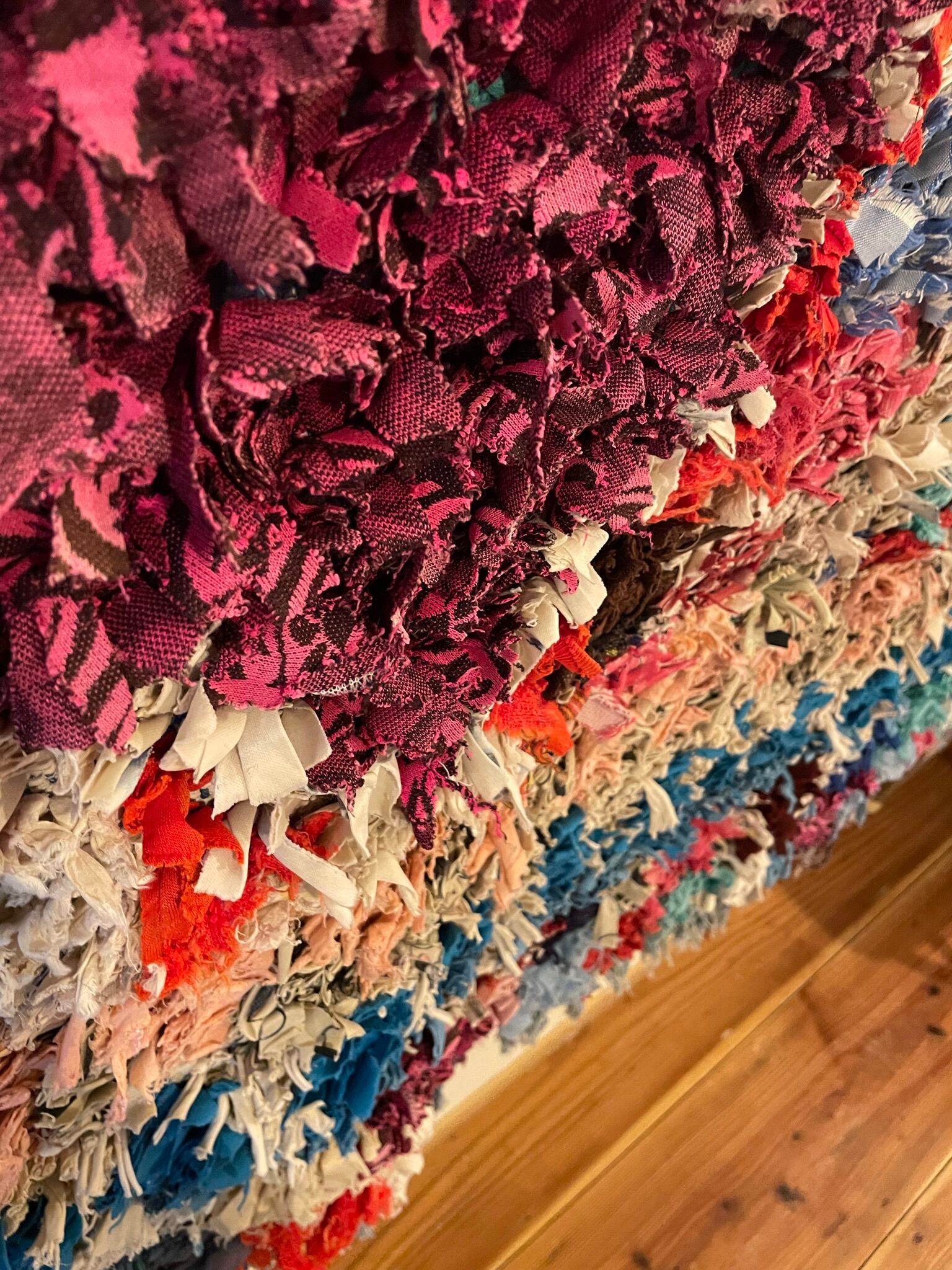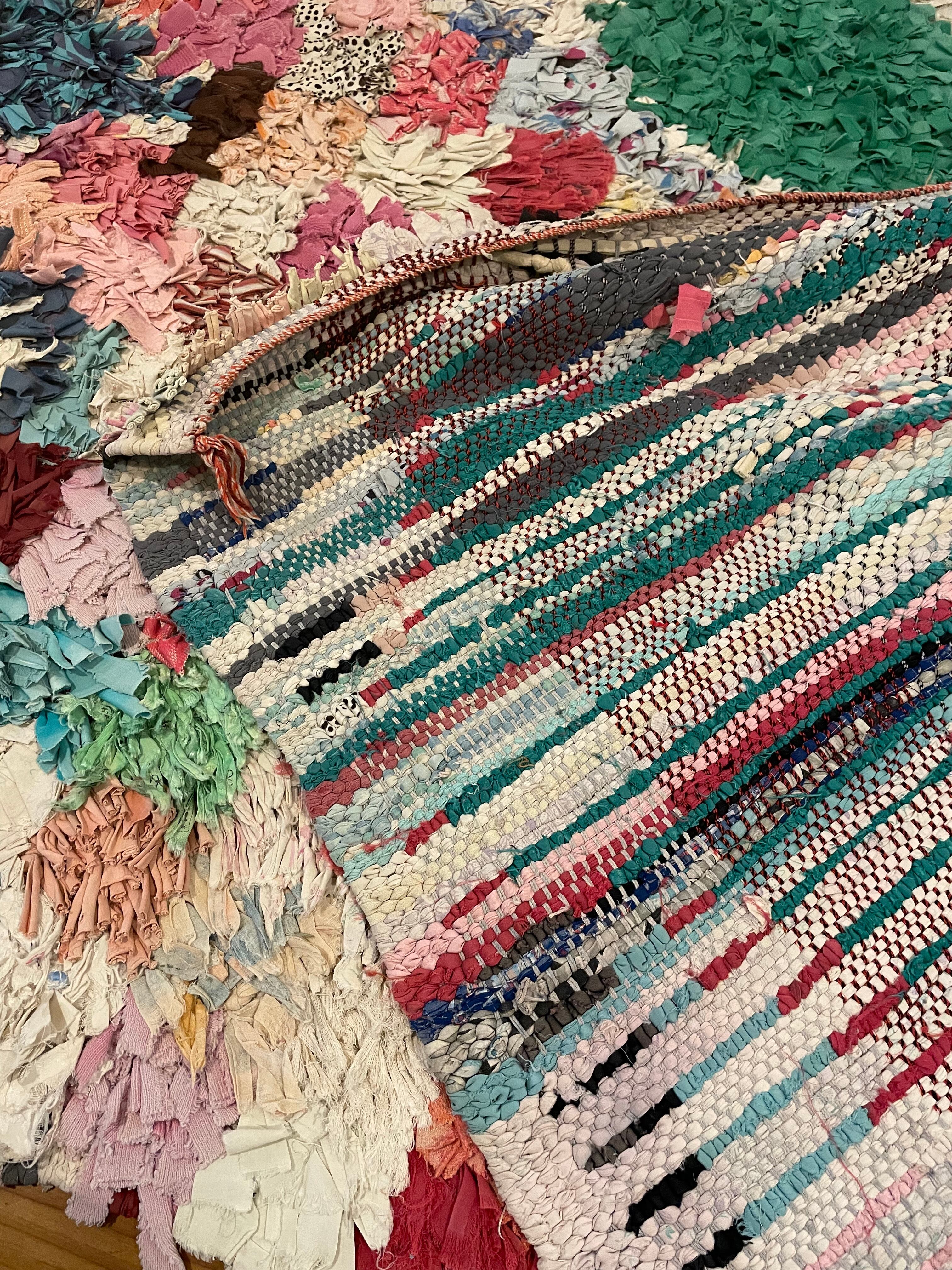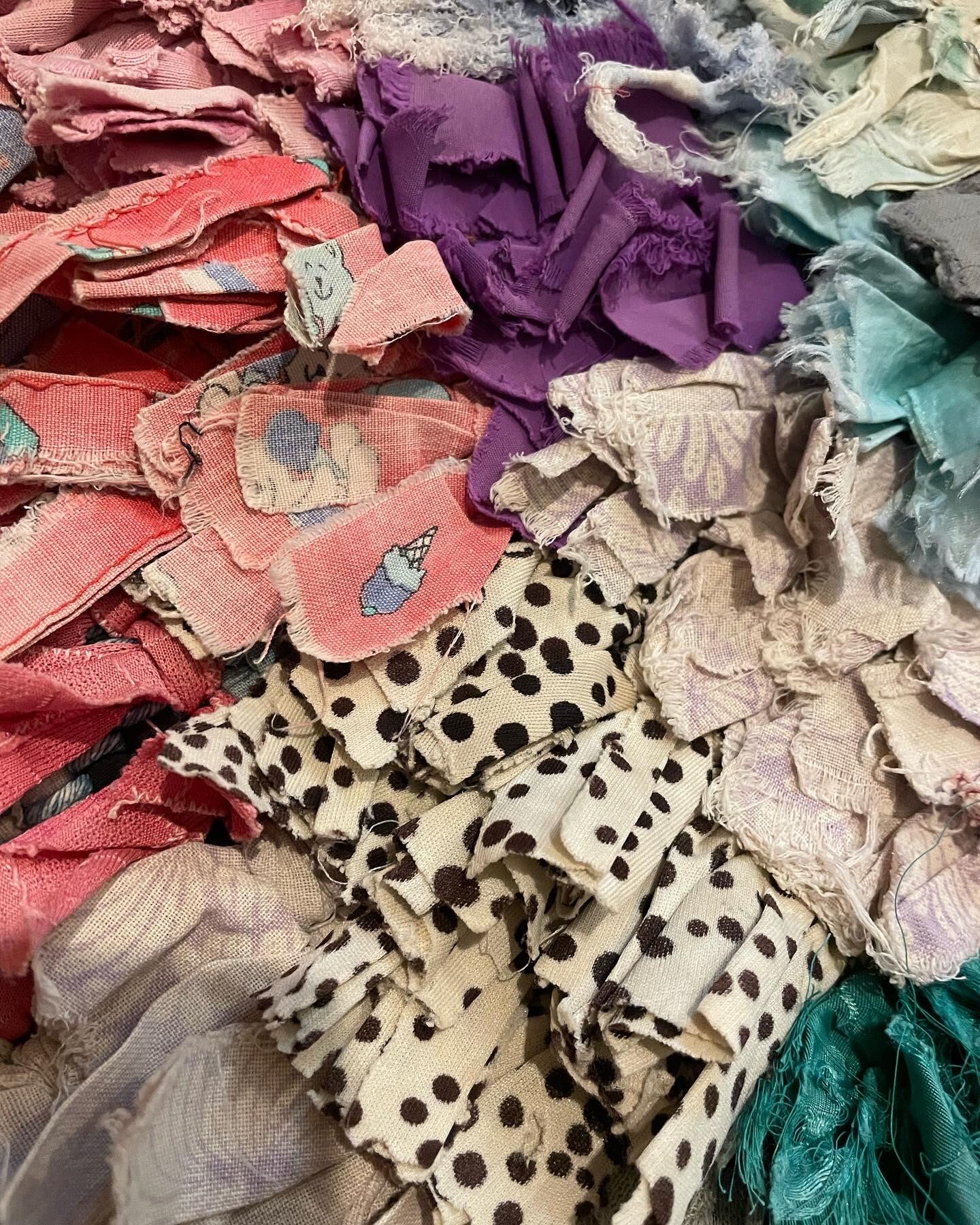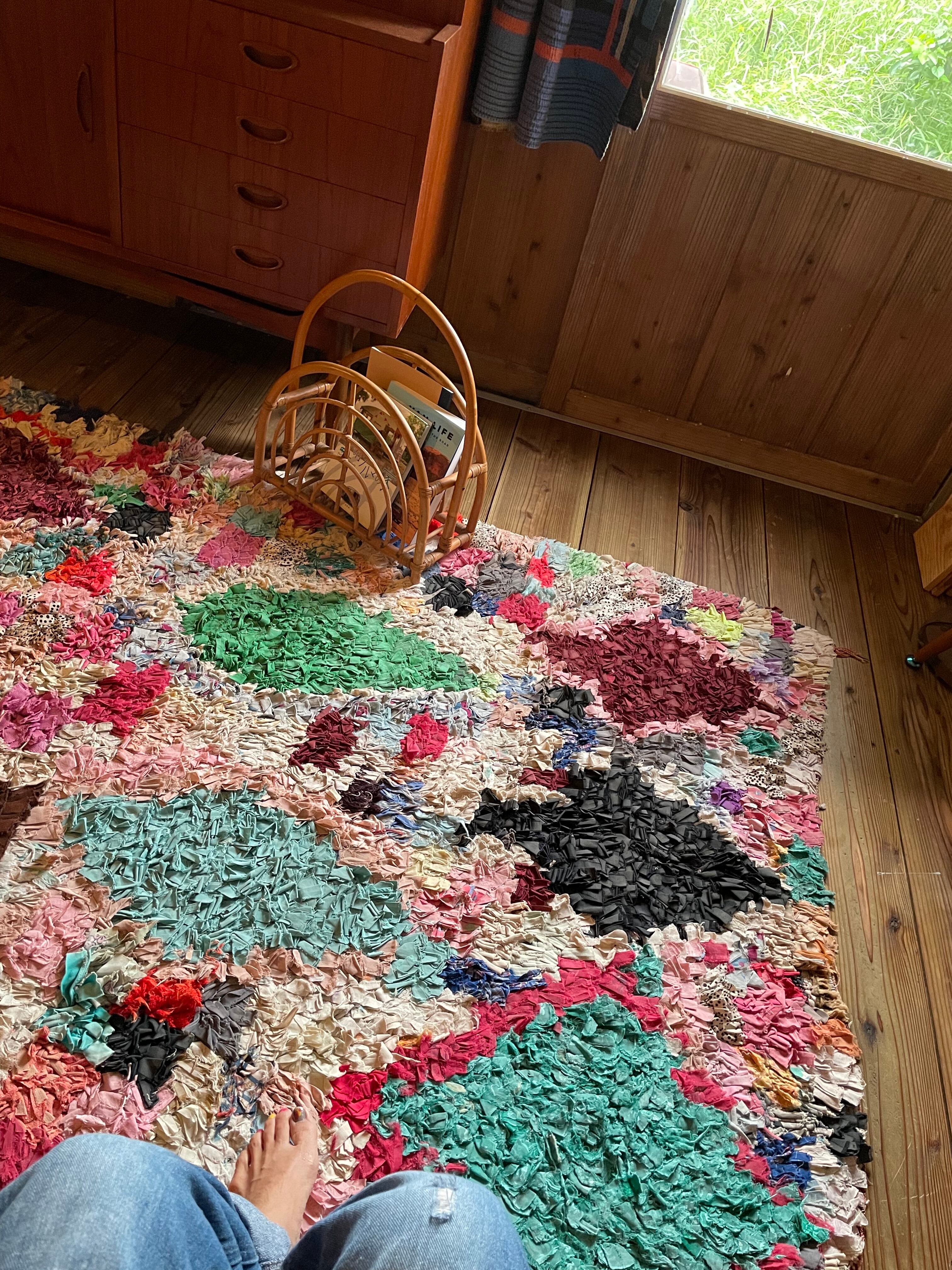 こちらのラグは優しい色のチェック柄やアイスクリーム柄、リネンなど、家族の思い出がたくさん詰まった一枚です。カラフルですが落ち着いた色合いで、優しさに包まれた空間になると思います。