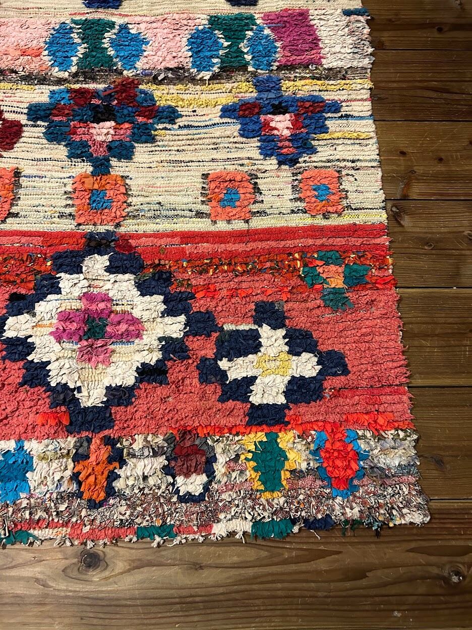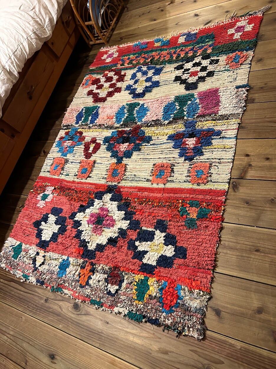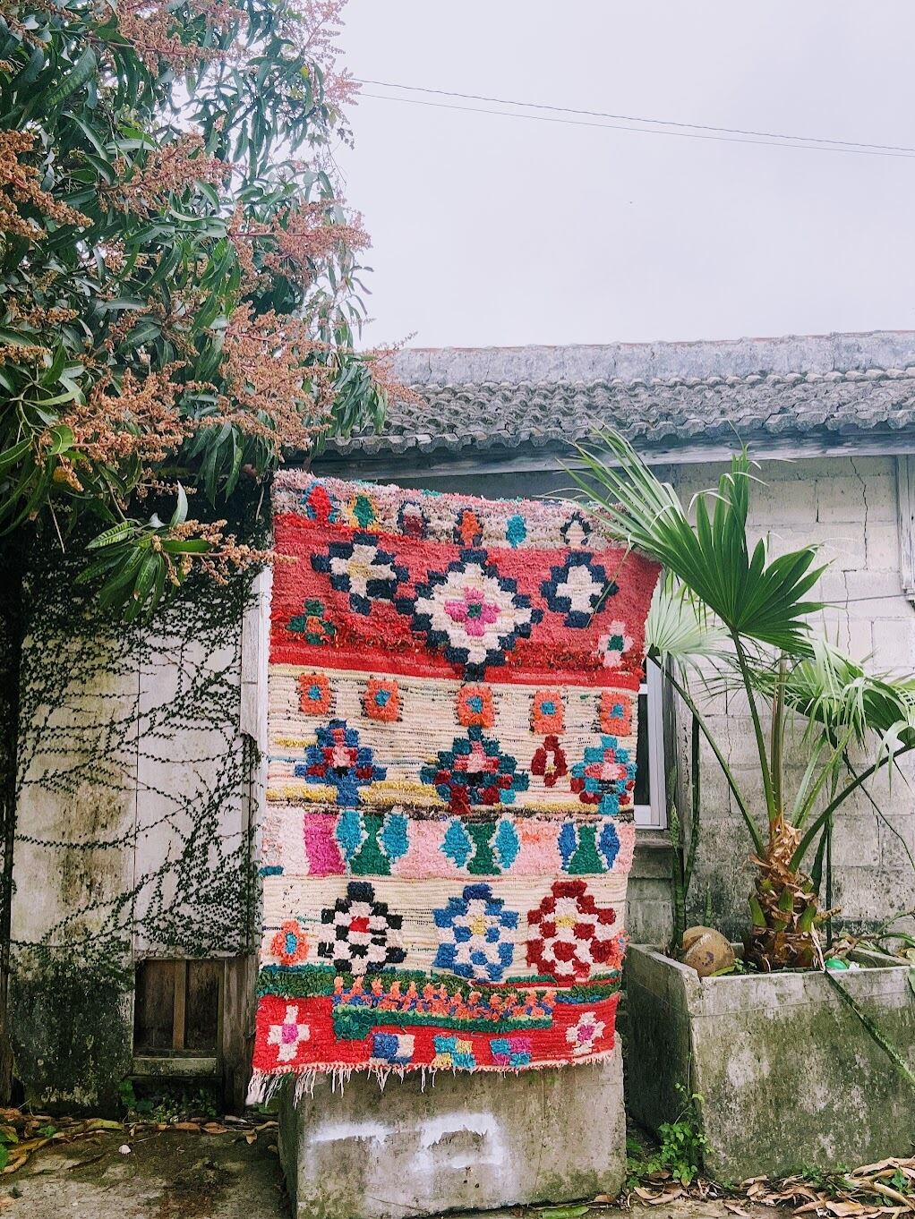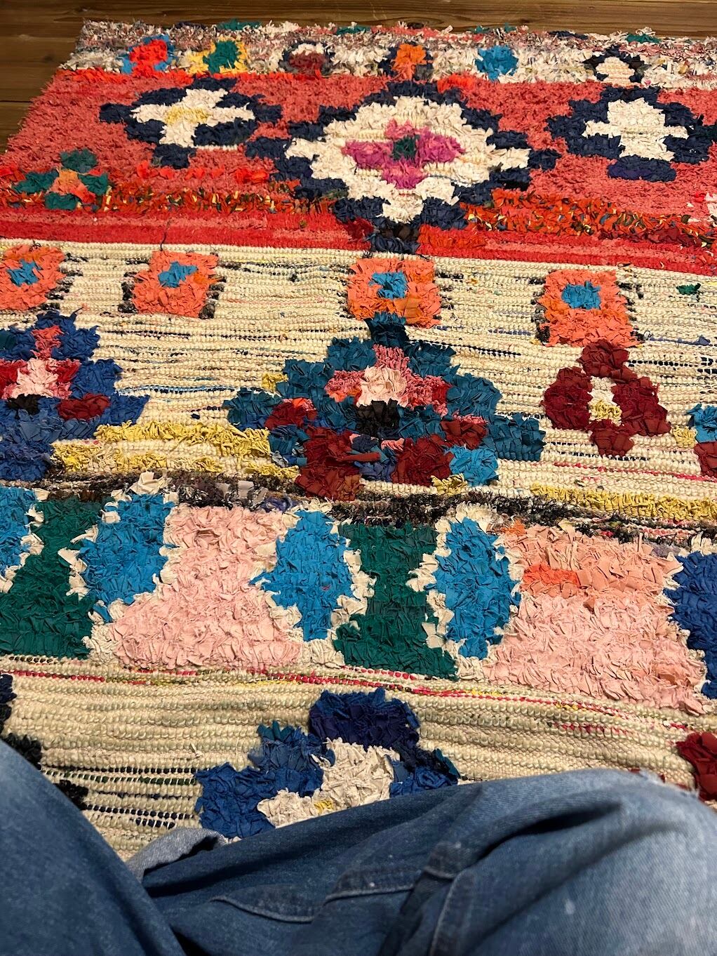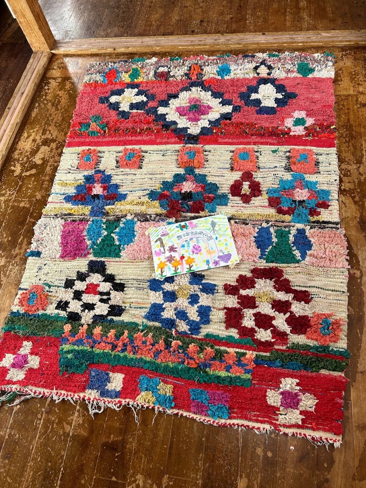 こちらのラグは娘が以前書いた絵にそっくりでした。立体的に浮かんでいるお花柄。織子さんも娘と似たような世界を想像して織ったのか。それとも、、そんな夢のような世界が目の前にあったのかもしれませんね。とても心躍る一枚です。