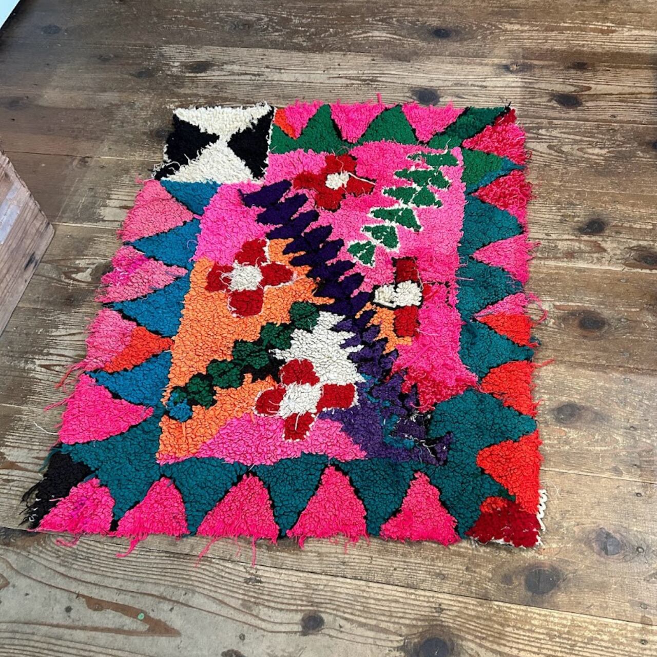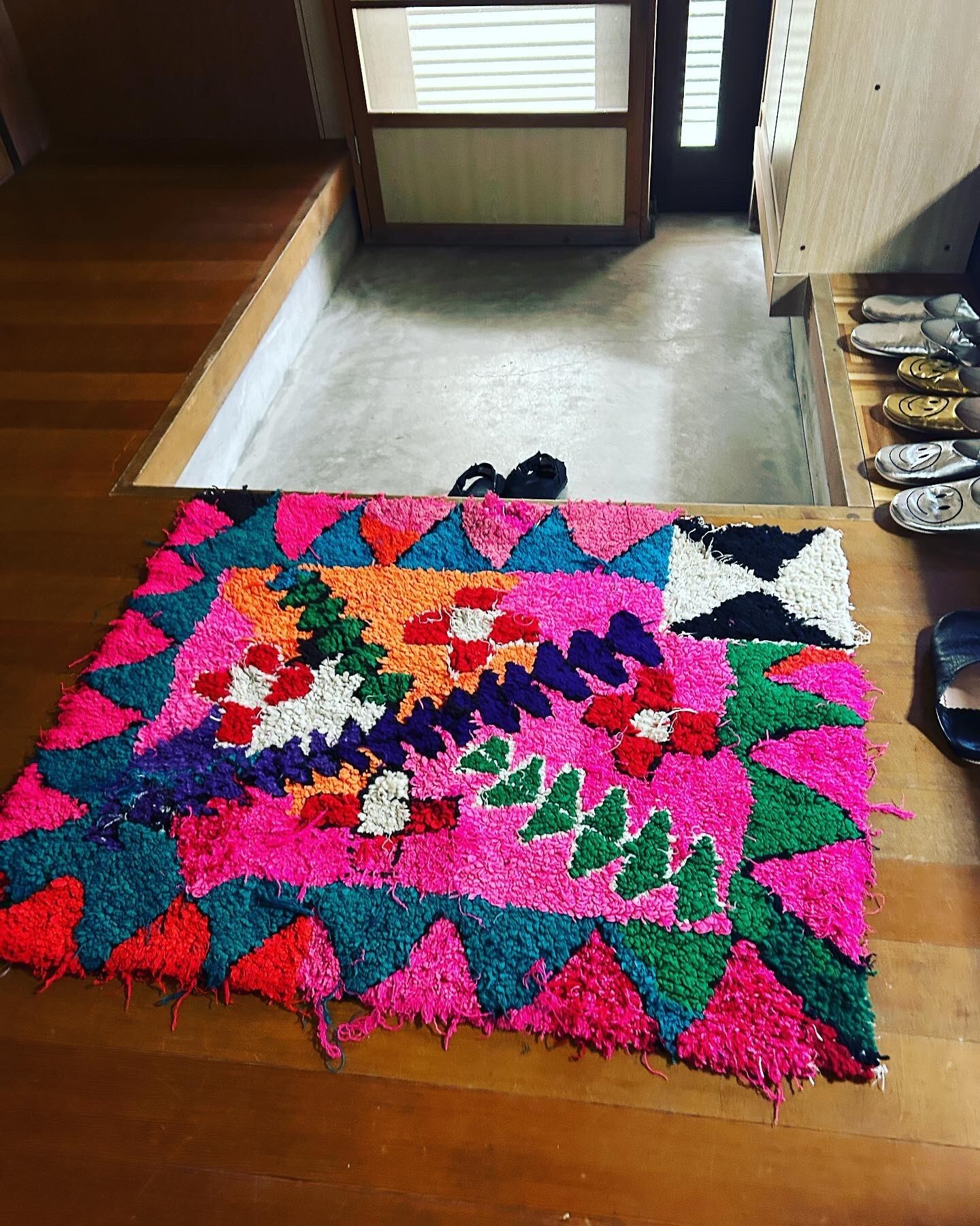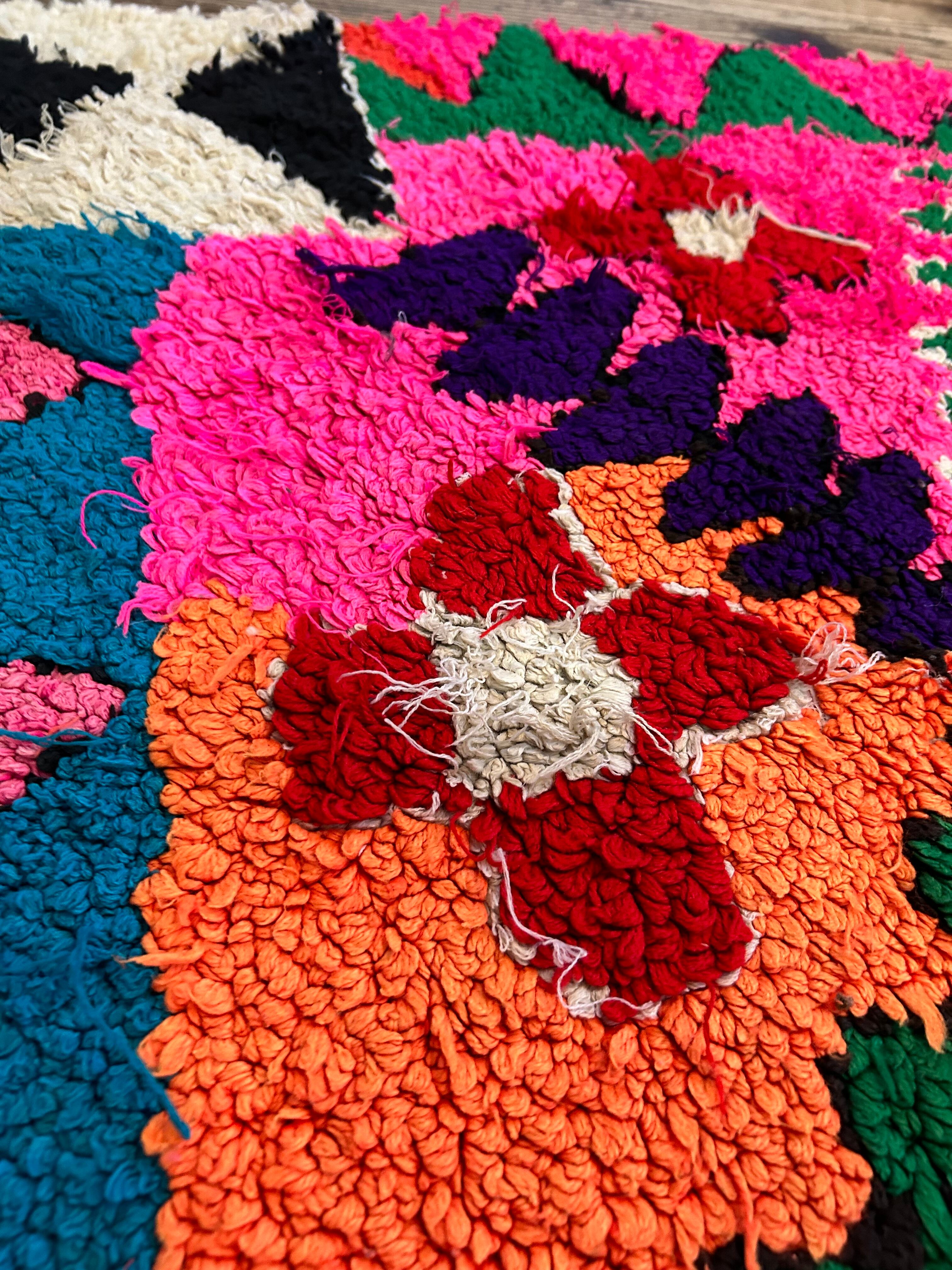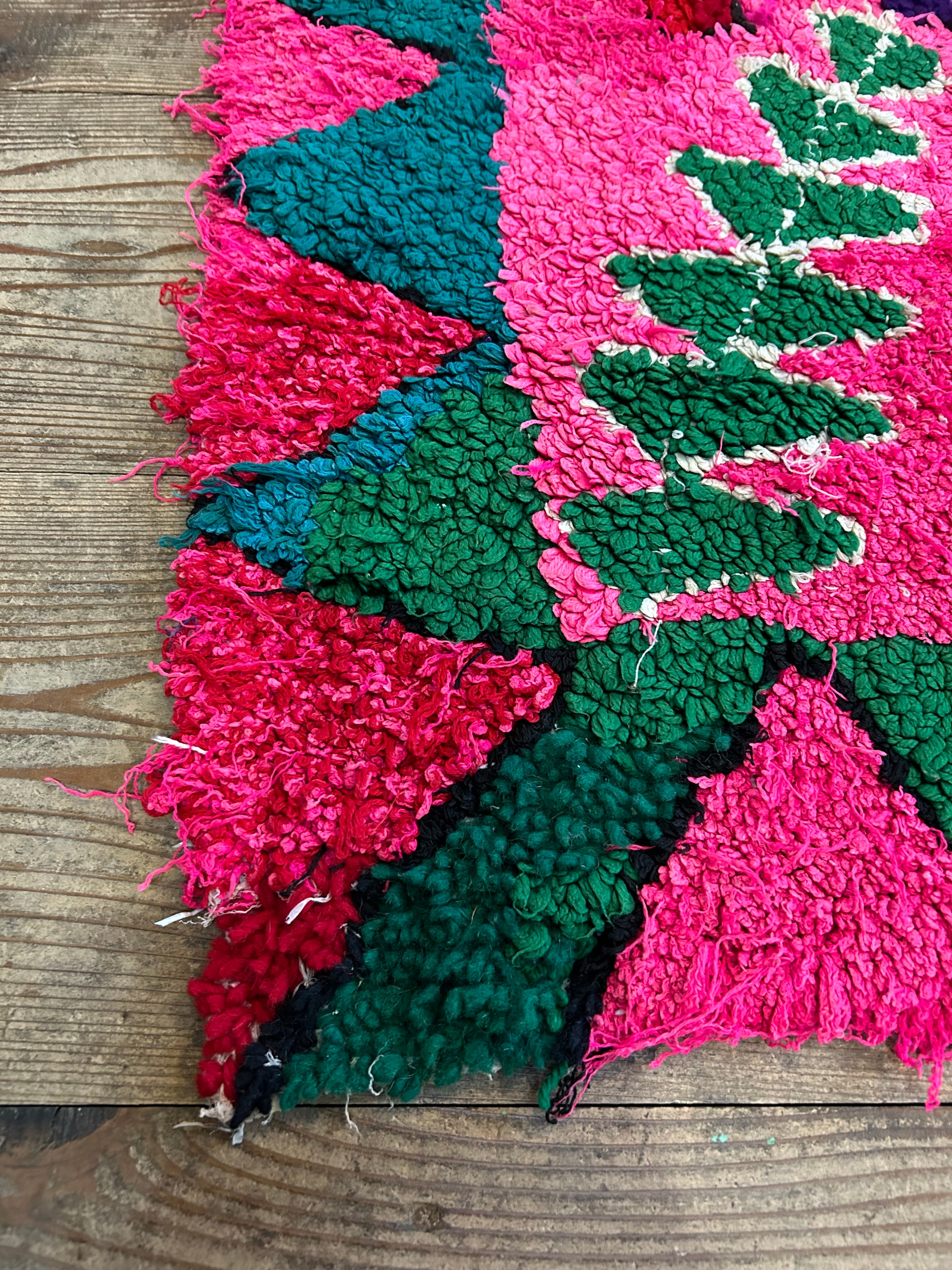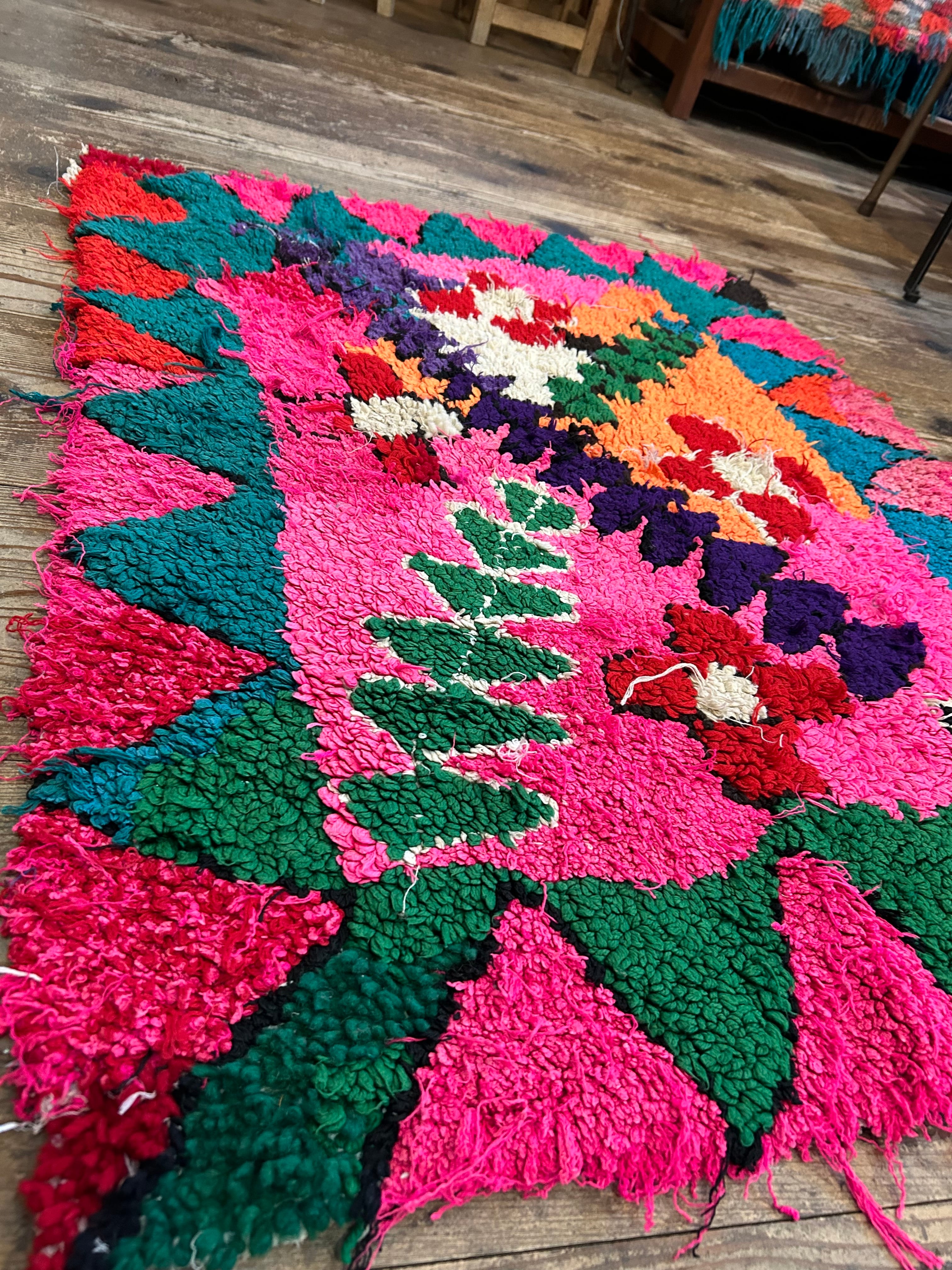 こちらのラグはパッと目がいくピンク色にお花模様。なぜだか、端っこに全く違うデザインが…面白いラグです。