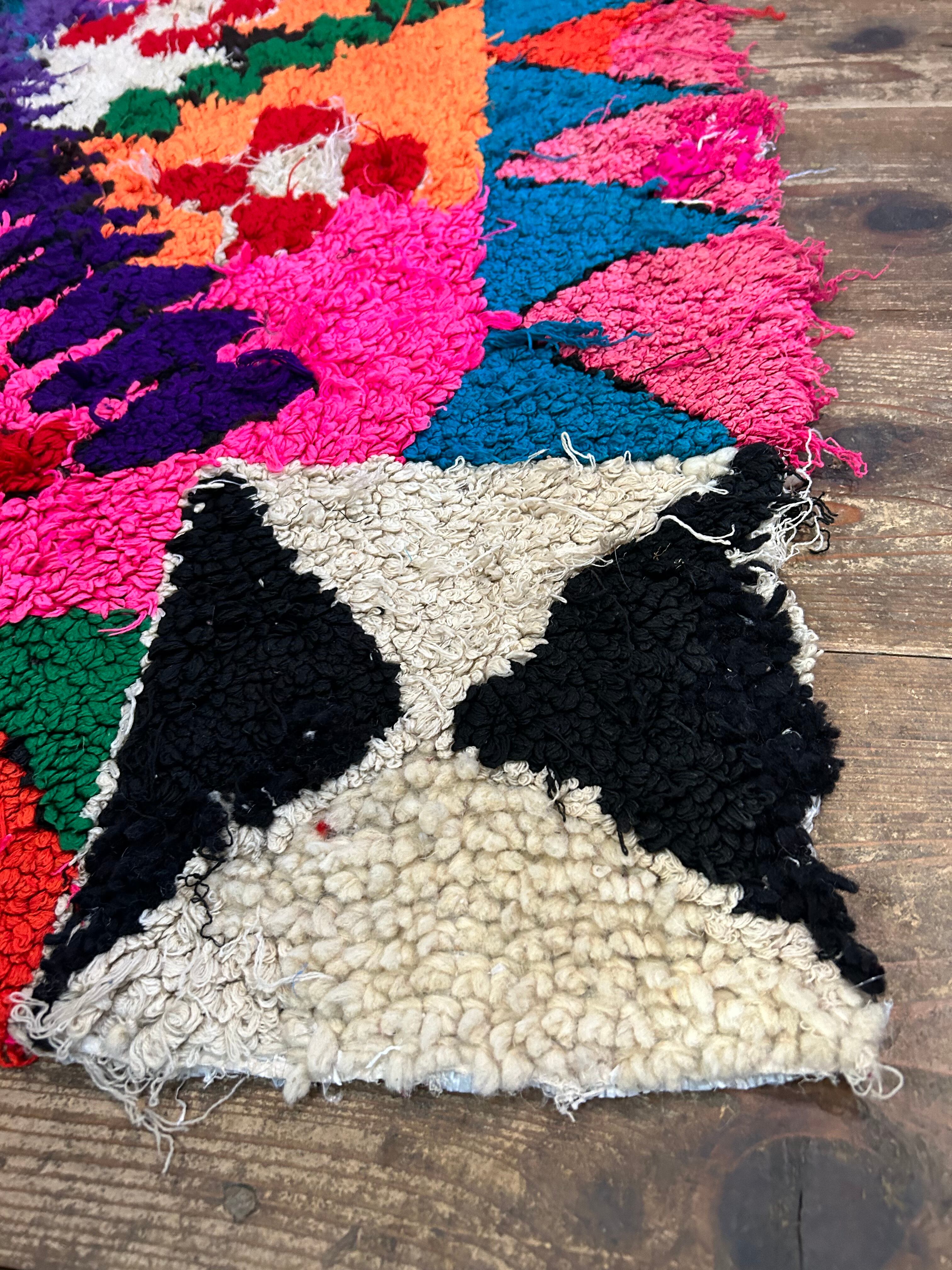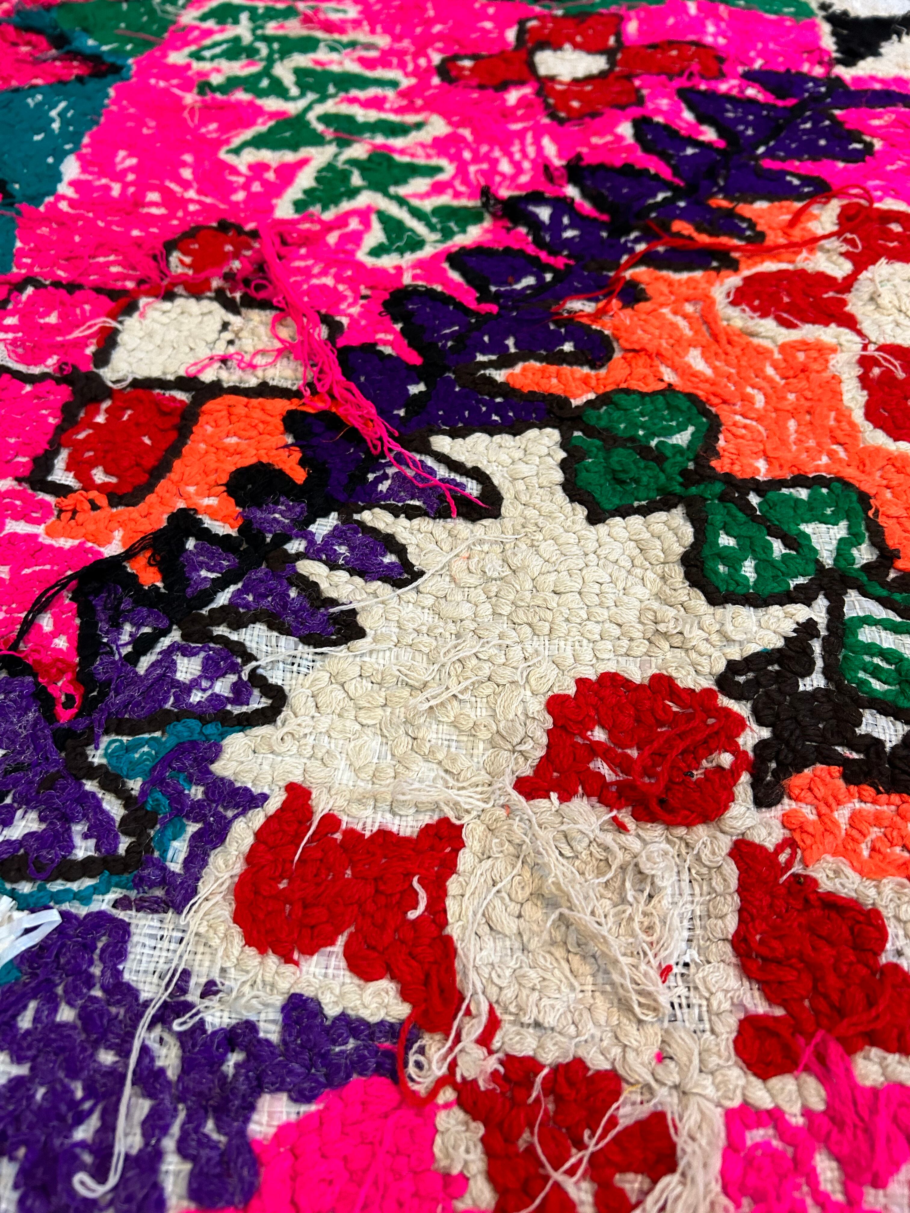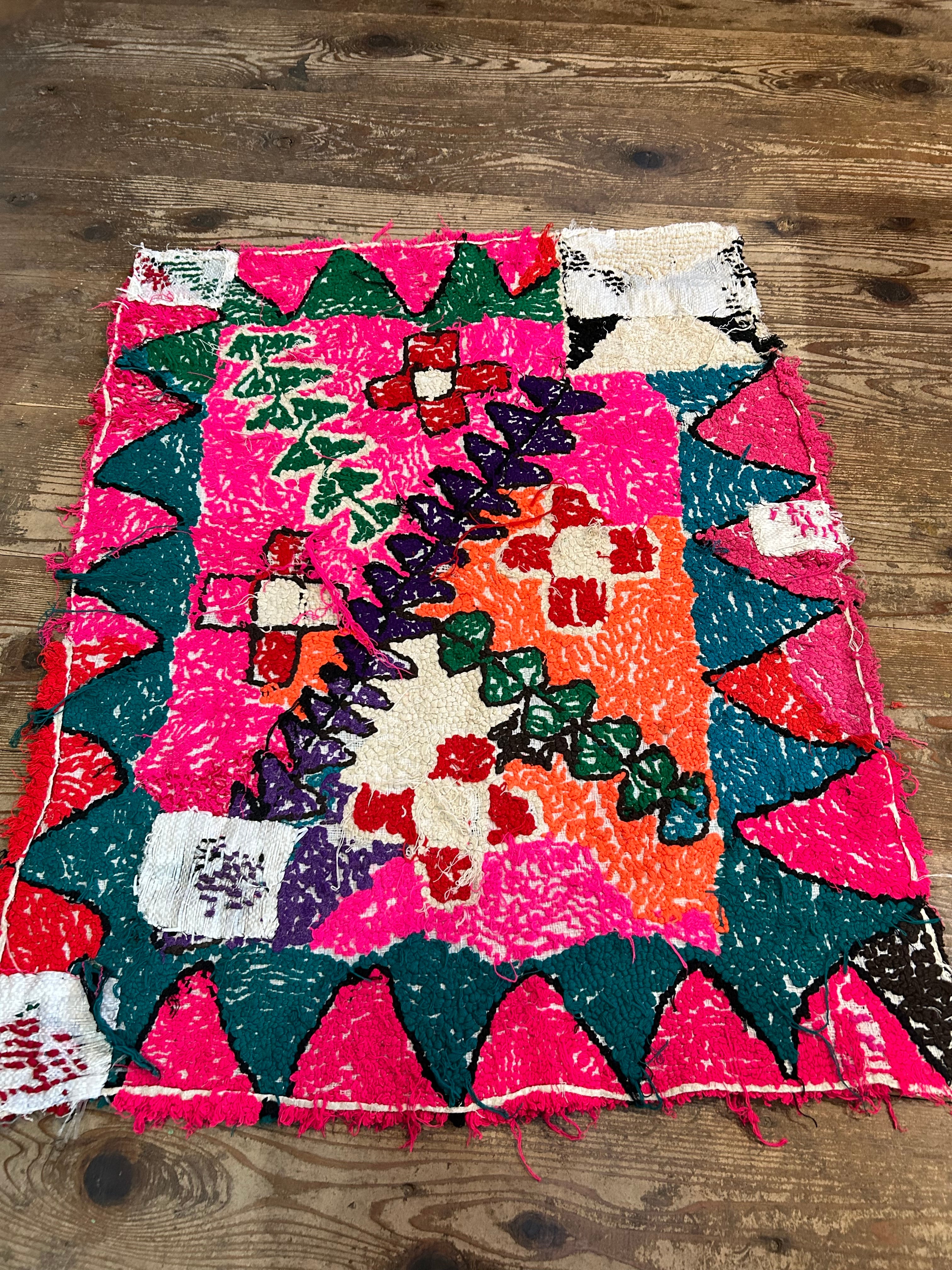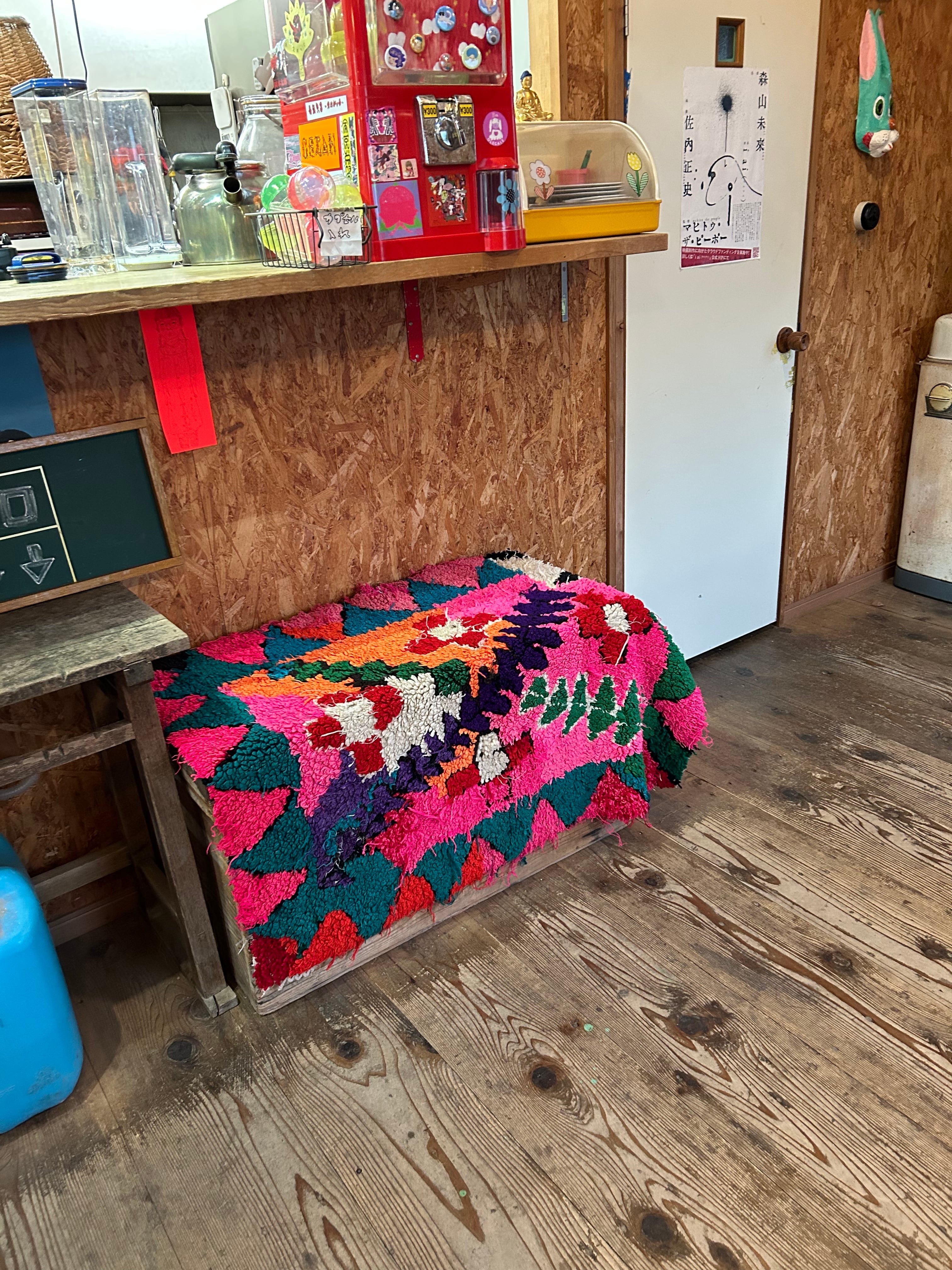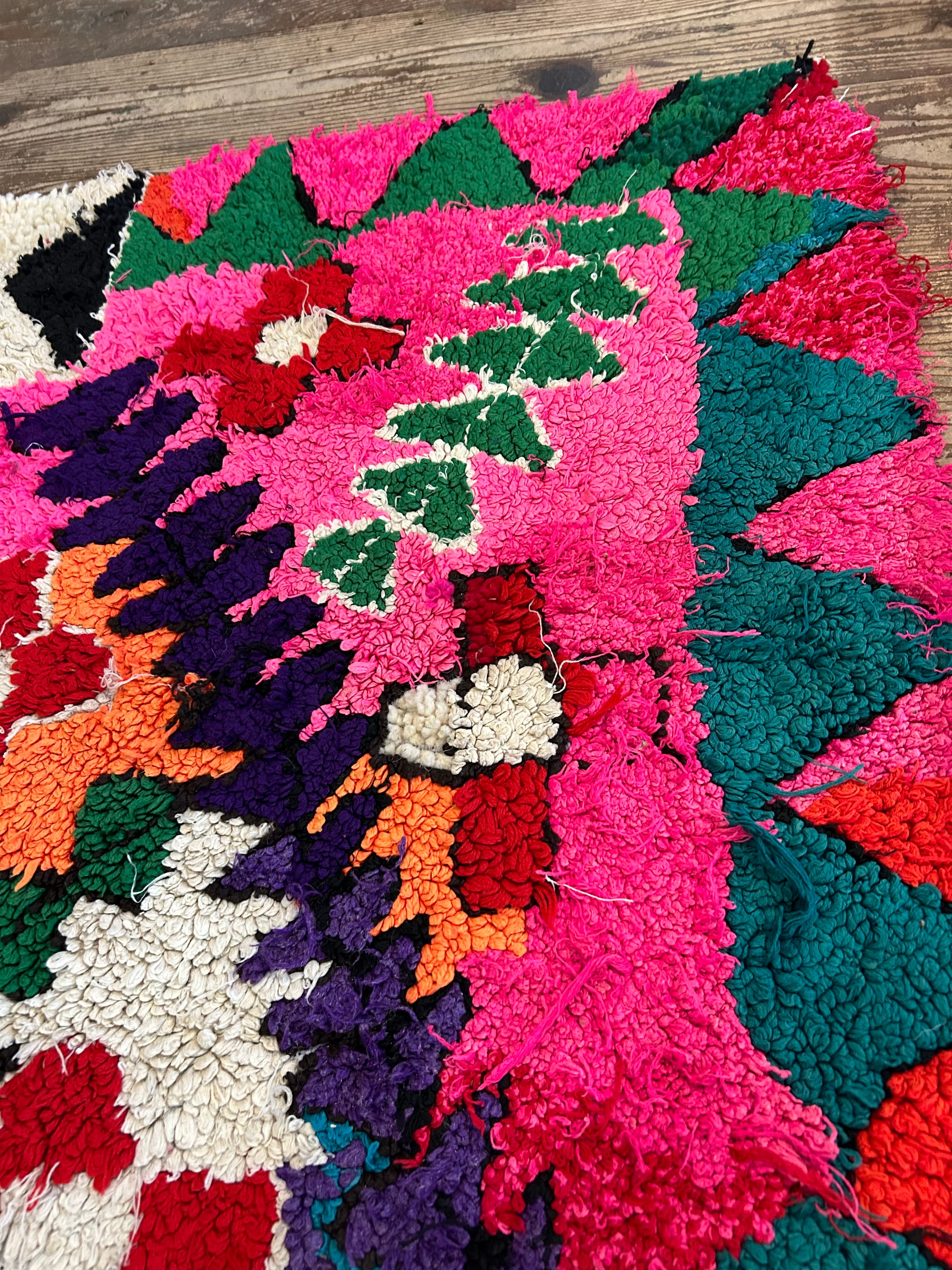 こちらのラグはパッと目がいくピンク色にお花模様。なぜだか、端っこに全く違うデザインが…面白いラグです。