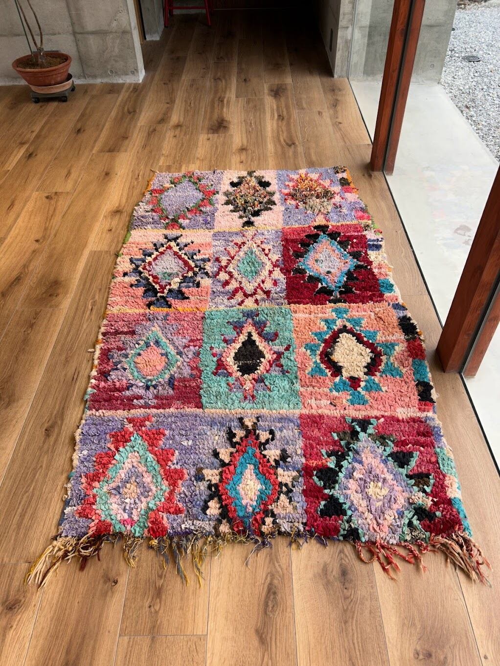 こちらのラグはピンクや薄紫の優しい色合いの中にも、はっきりとした柄で力強さや個性を感じられる一枚です。